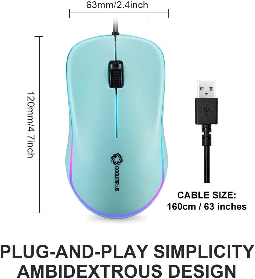 • Plug and Play USB Mouse with rainbow light, Precise tacking and easy selction, No need to install any other drivers or software. The high-quality USB plug make the mouse easy to use and stable. Coolerplus mouse with flash rainbow light.