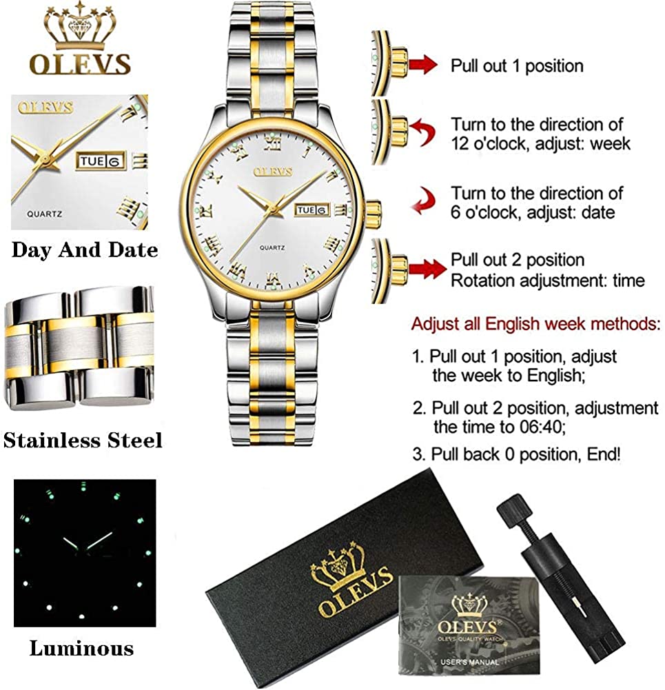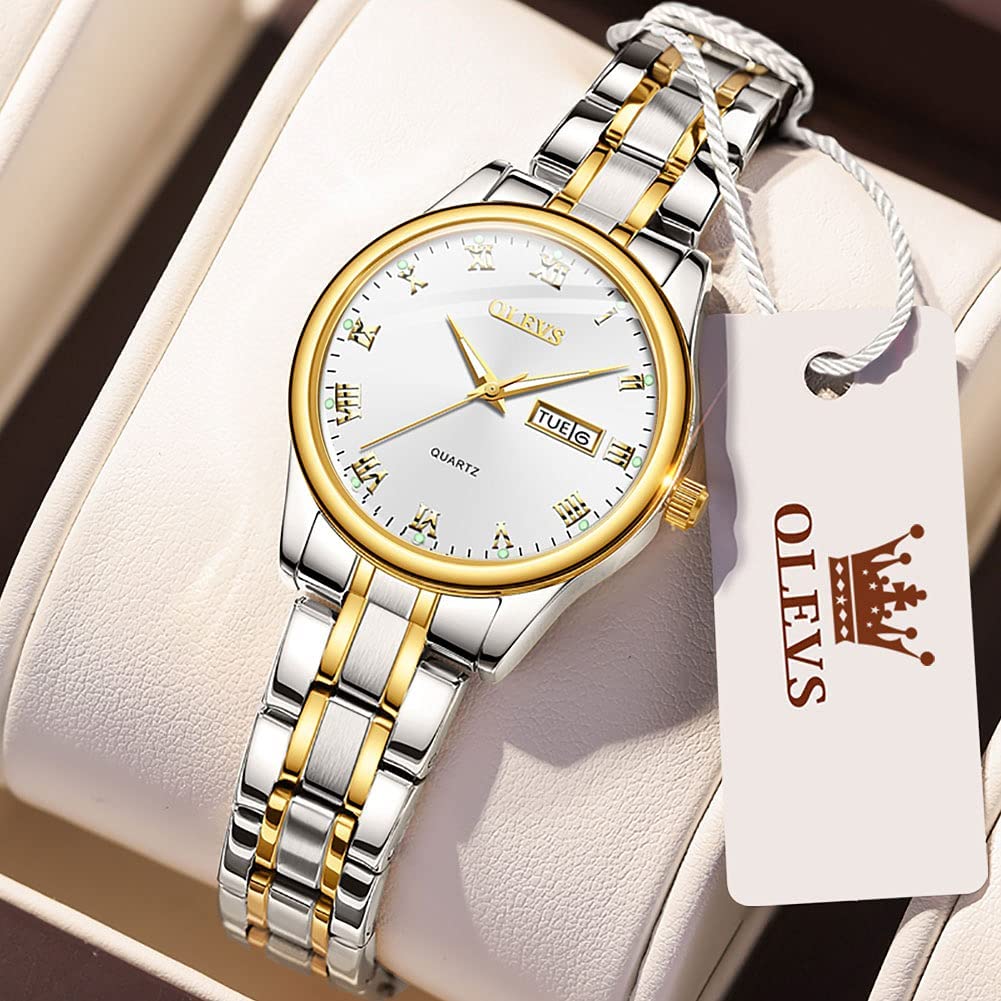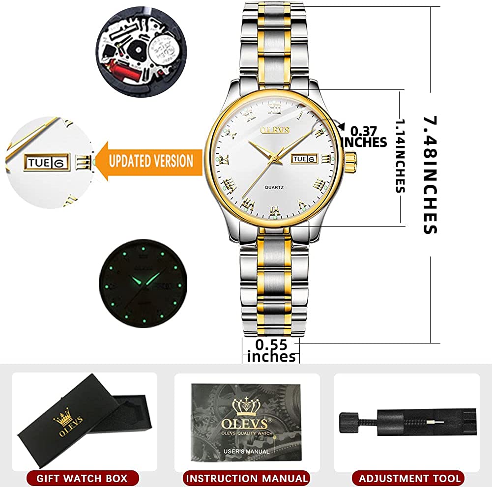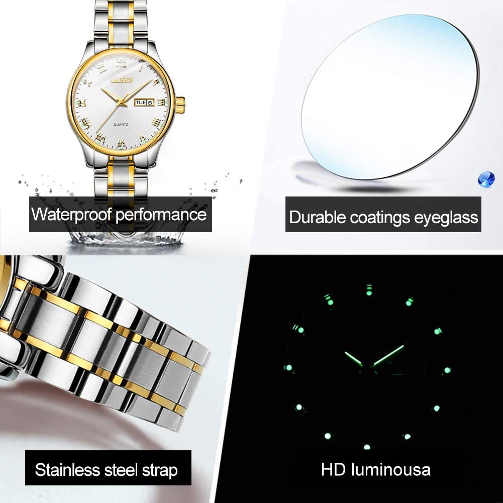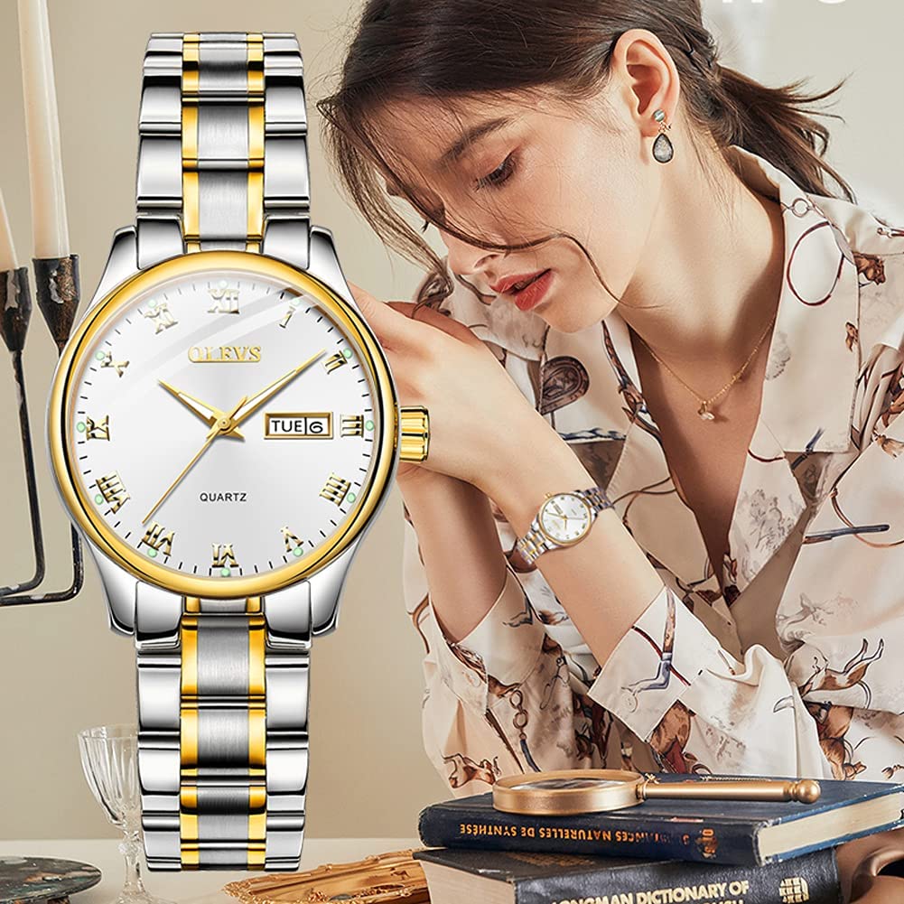 Business Women Watches Day Date,Woman Watches with Silver Gold Stainless Steel,Fashion Luminous Ladies Watches with Black/White Dial,Roman Numeral Womens Watches,Small Face Waterproof Ladies Watches