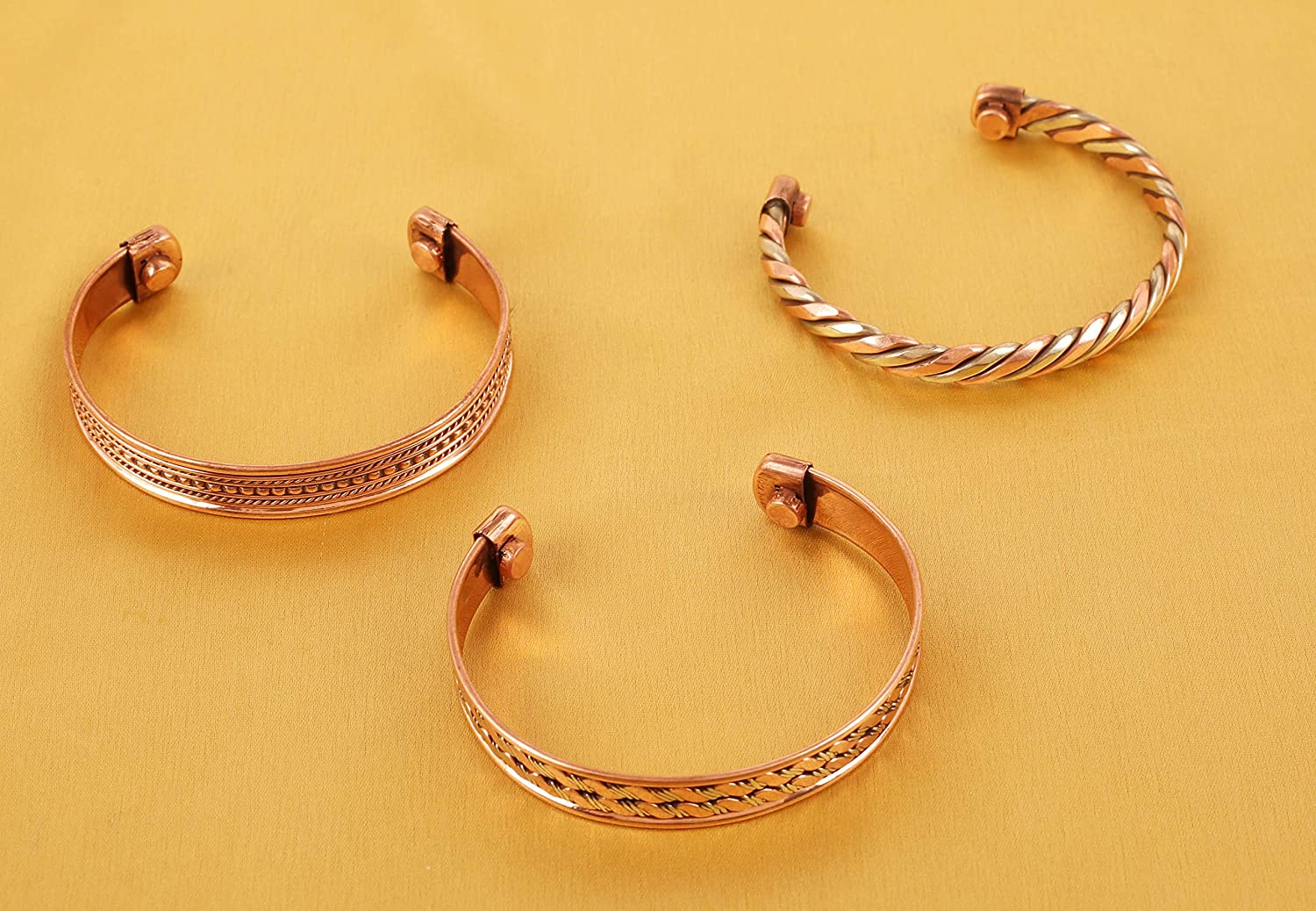 - Beautiful design and attention to detail. Handcrafted by rural artisans in India with techniques inherited through generations.Thick and sturdy. Lasts a lifetime. 3 different traditional designs of copper inlaid with Brass.