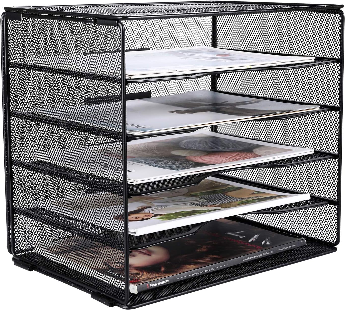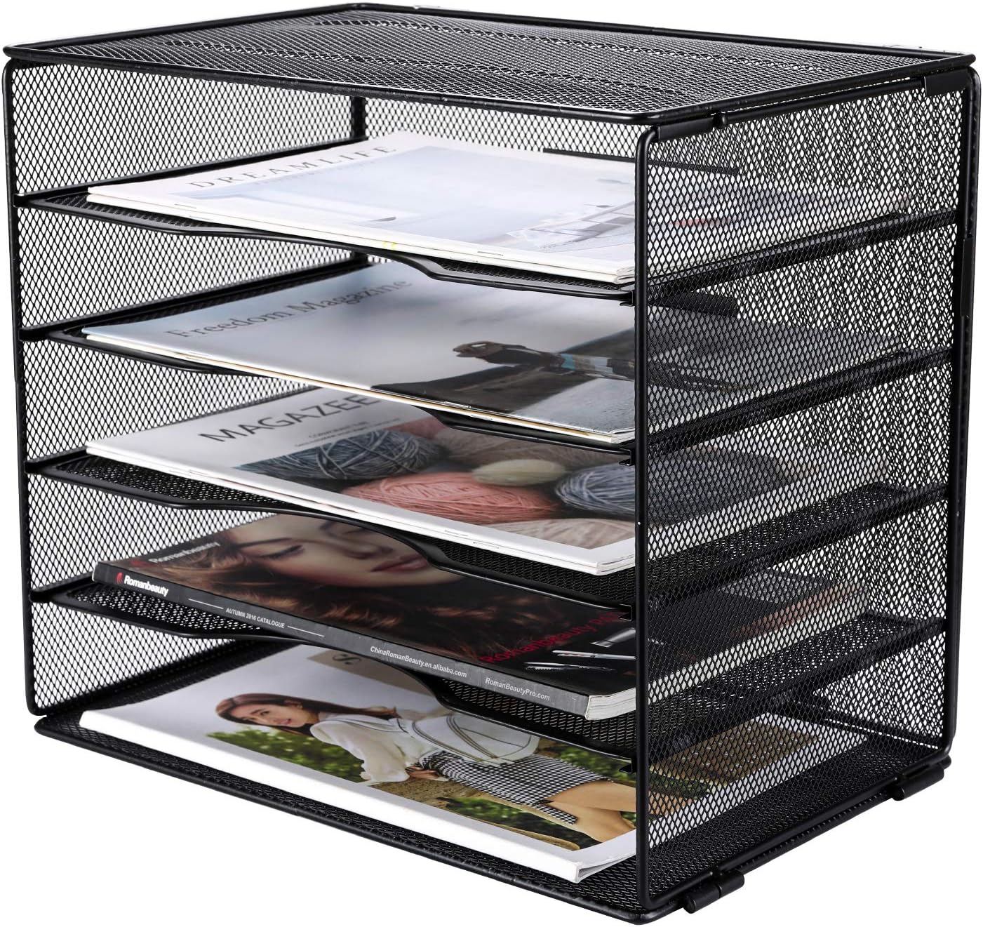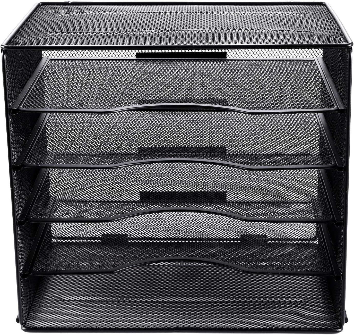 Mesh construction desk file organizer, open design lets you see inside the organizer to identify the contents of each compartment quickly,features 5 tiers of storage horizontal slots for mail, forms, catalogs, invoices, papers, bills and other supplies; compartments are designed to accommodate paper sizes up to 9 x 13 inch