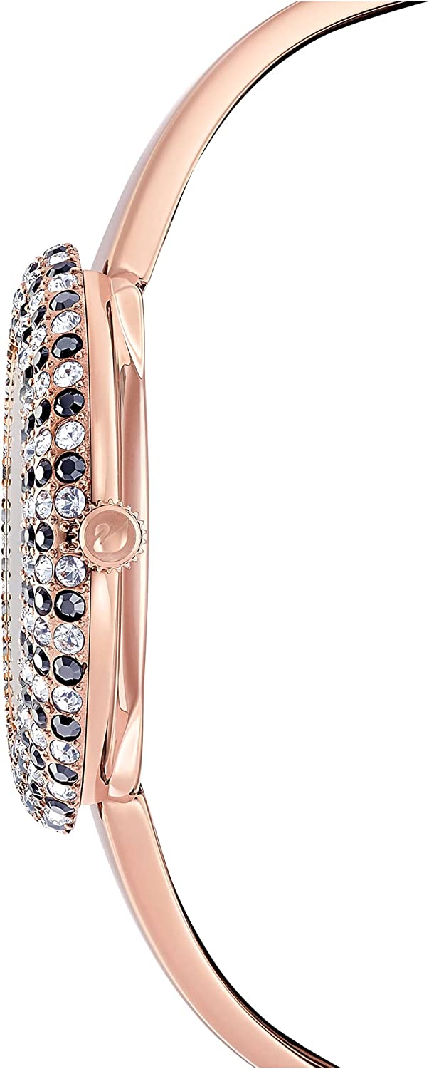 Beautiful and elegant: This watch combines the precision and quality of sparkling Swarovski crystals with the dazzling black face and alluring rose-gold tone stainless steel case and bangle