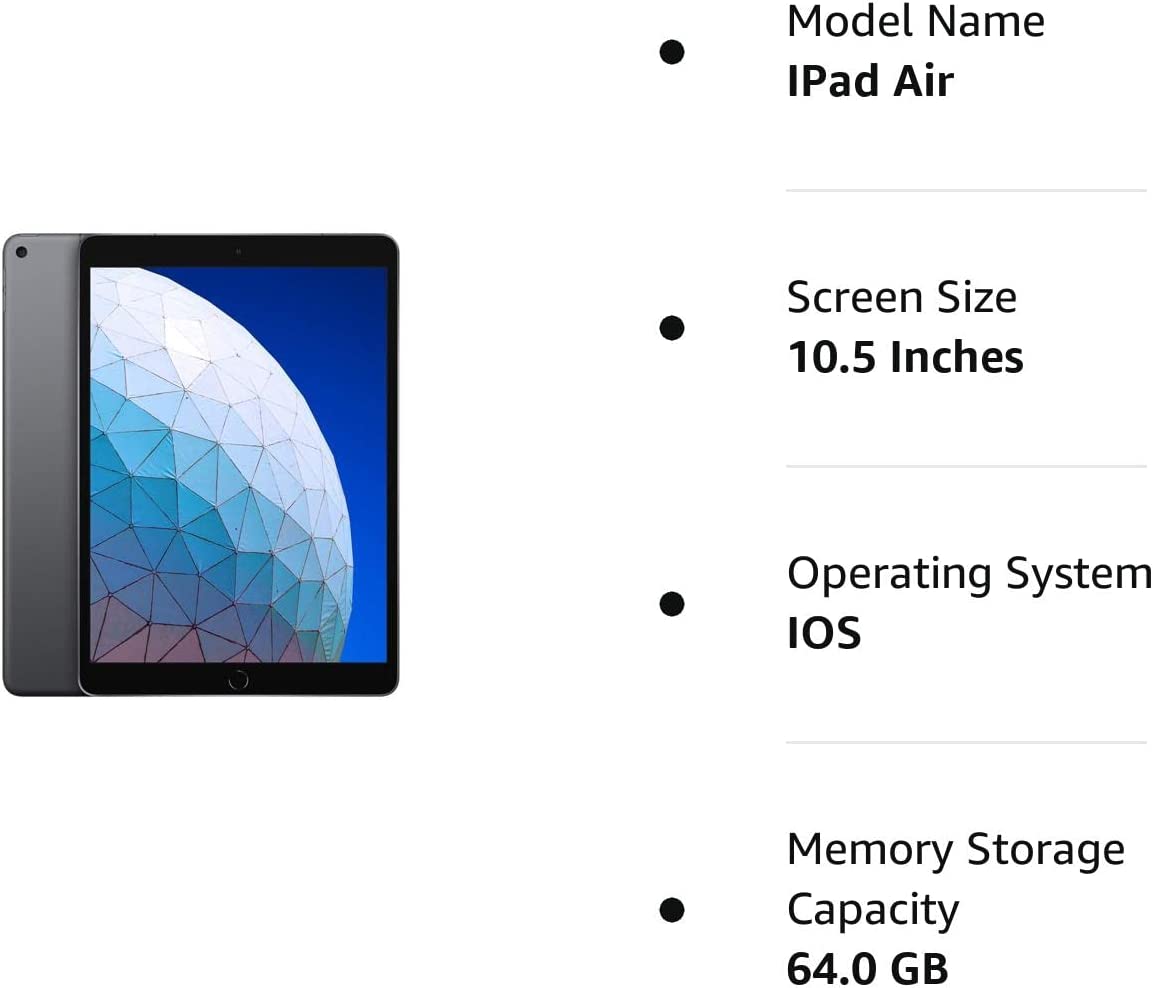 10.5-Inch Retina Display with True Tone and wide Color A12 Bionic chip | Touch ID Fingerprint Sensor and Apple Pay 8MP back camera, 7MP FaceTime HD Front camera Stereo speakers | 802.11AC Wi-Fi Up to 10 hours of battery life