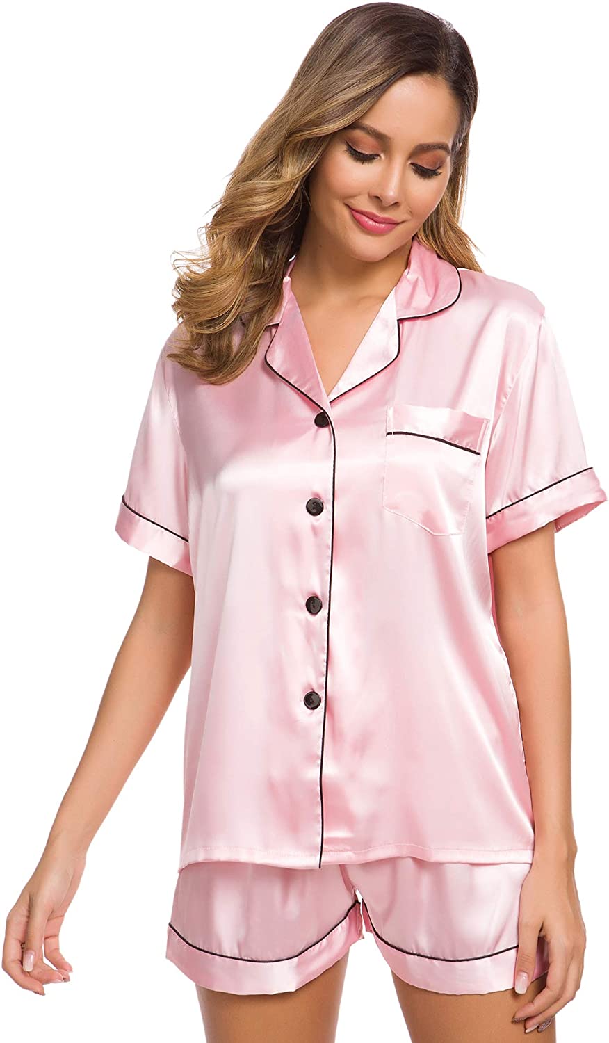 SWOMOG Womens Silk Satin Pajamas Set Two-piece Pj Sets Sleepwear Loungewear Button-Down Pj Sets