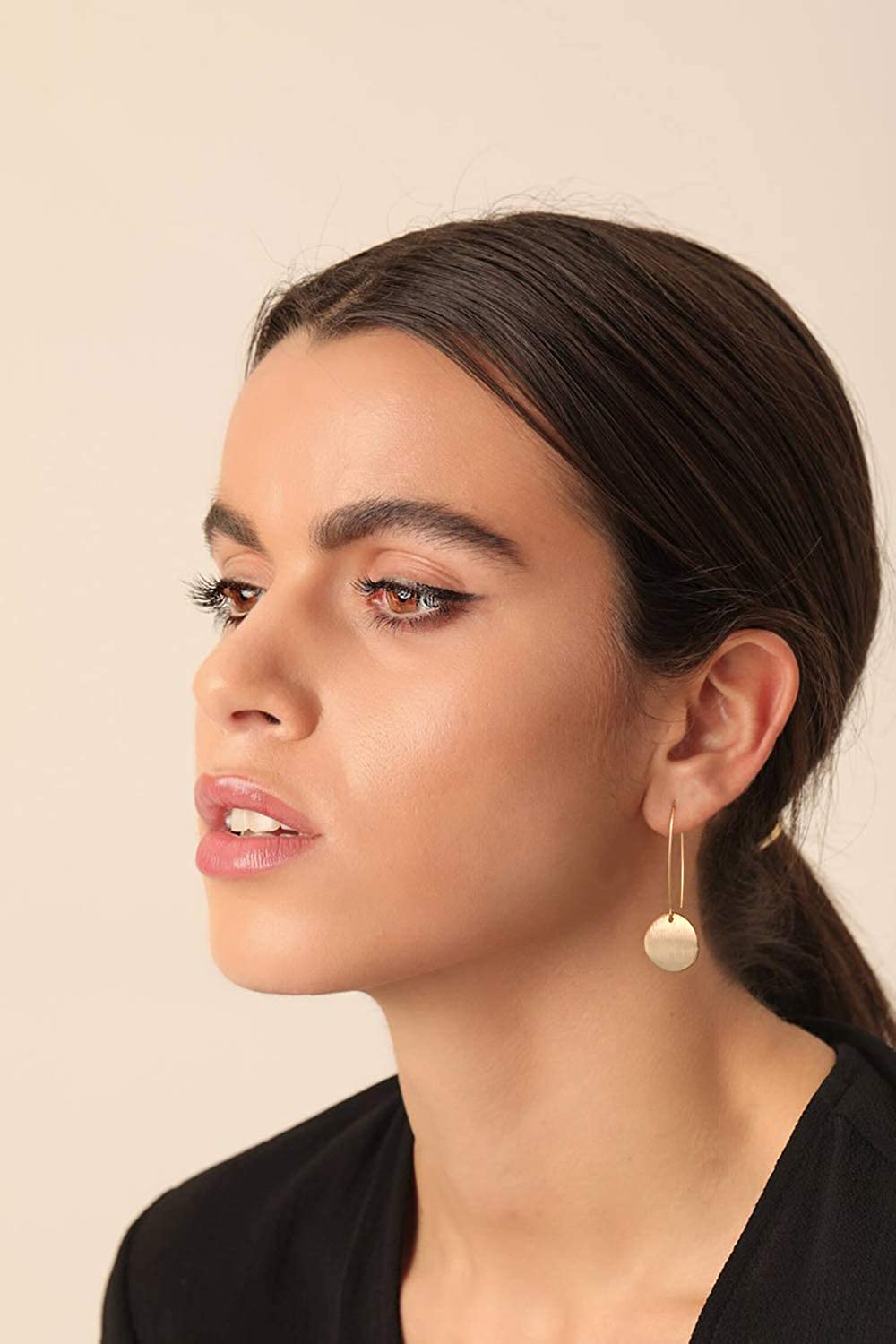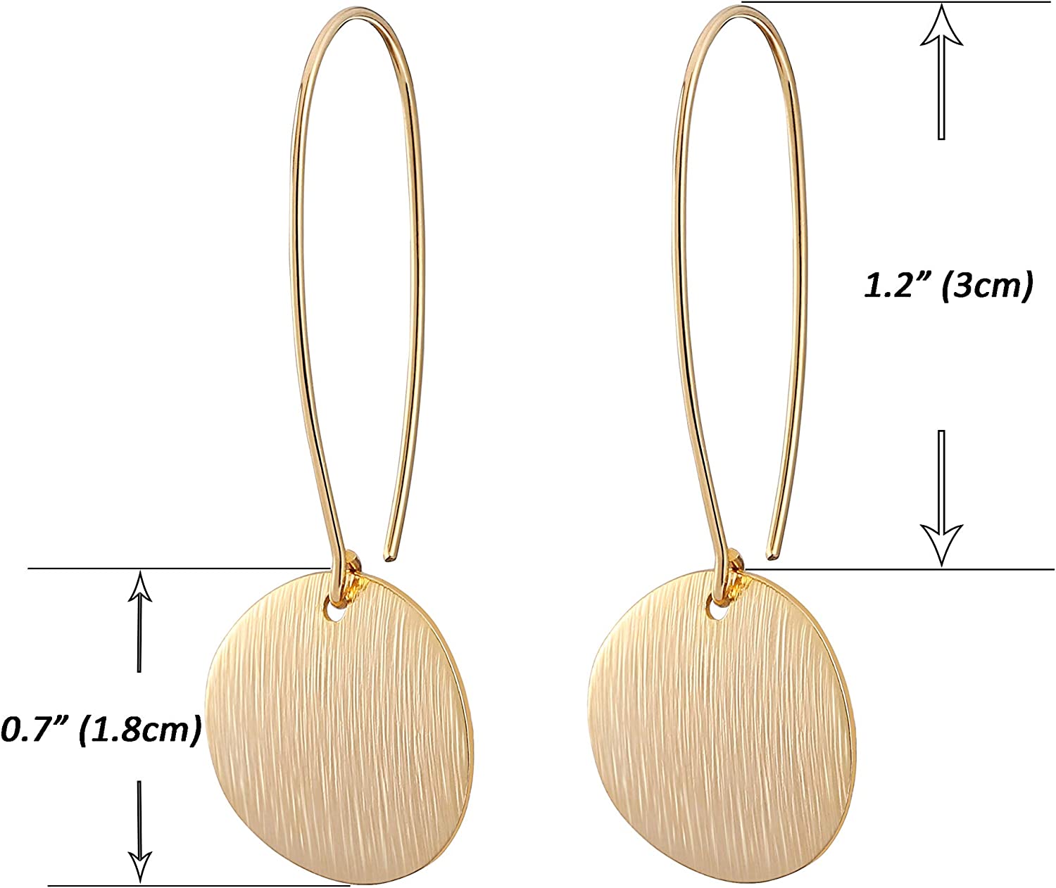 - Earring Design: Golden dangle earrings drop hoops with beautiful dainty and sparkling classic disc. A timeless design perfect for any age making circle drop earrings a great gift choice. You can choose disc drop earrings as ideal gift for birthday, Thanksgiving Day, Valentine’s Day, anniversary, graduation, Mother's Day, Christmas, etc. The minimalist earrings are especially suitable everyday jewelry for women and girls.