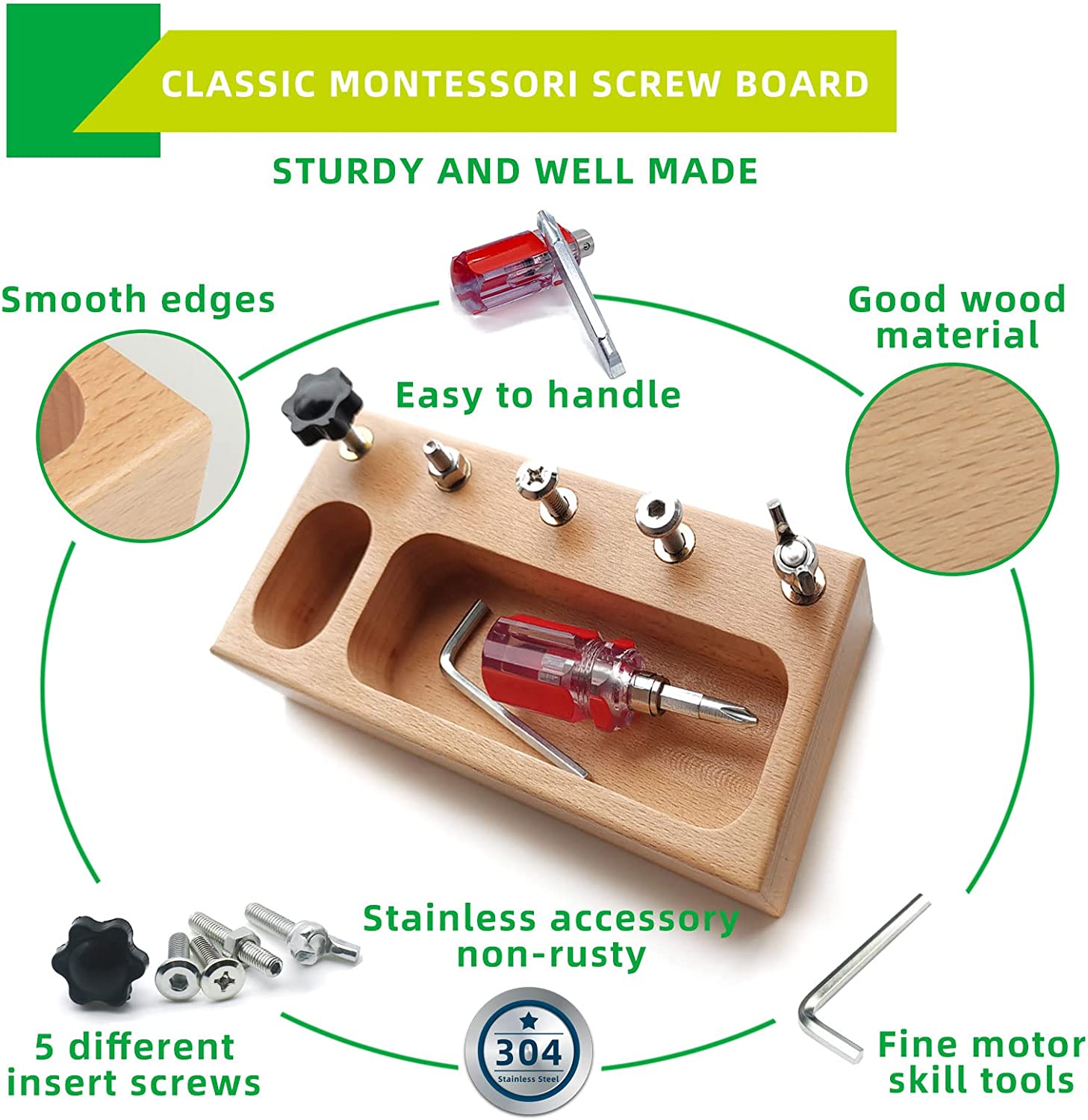 • Montessori Screw Board Will Help Teach Children (3-6) The Practical Life Skill of Using A Screw Driver. The Montessori Materials Board Will Also Teach Hand Eye Coordination While Working on Fine Motor Skills.