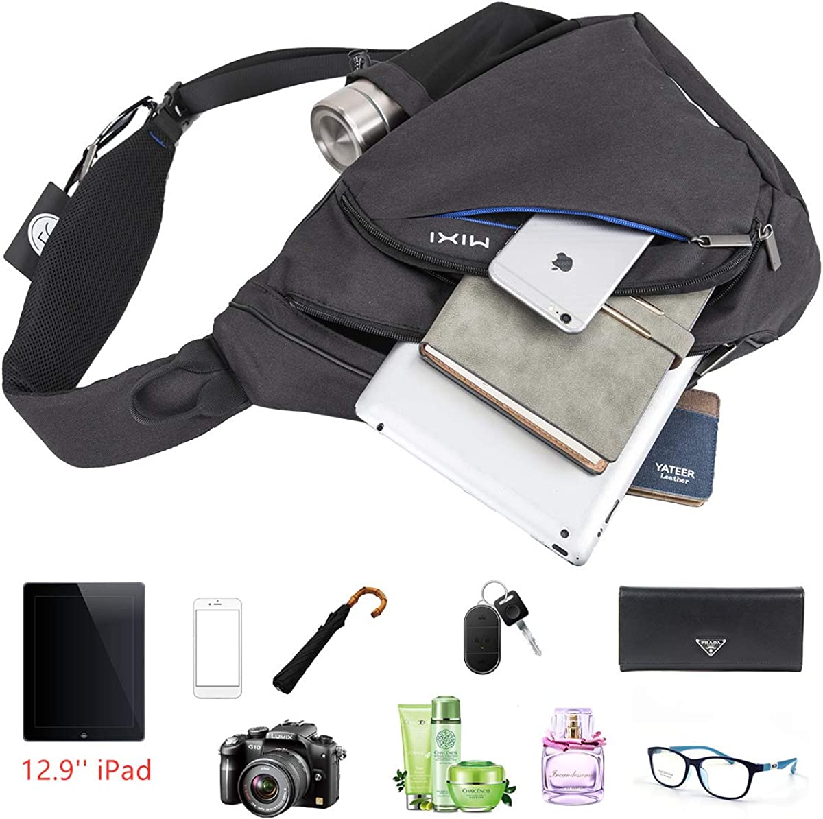ANTI-THEFT SLING BAG - 11.81x5.11x18.7’’(L x W x H) with hidden anti-theft pocket, external mesh side pocket, roomy main pocket fits 12.9'' Ipad Pro and include several multifunctional pockets all your essentials.