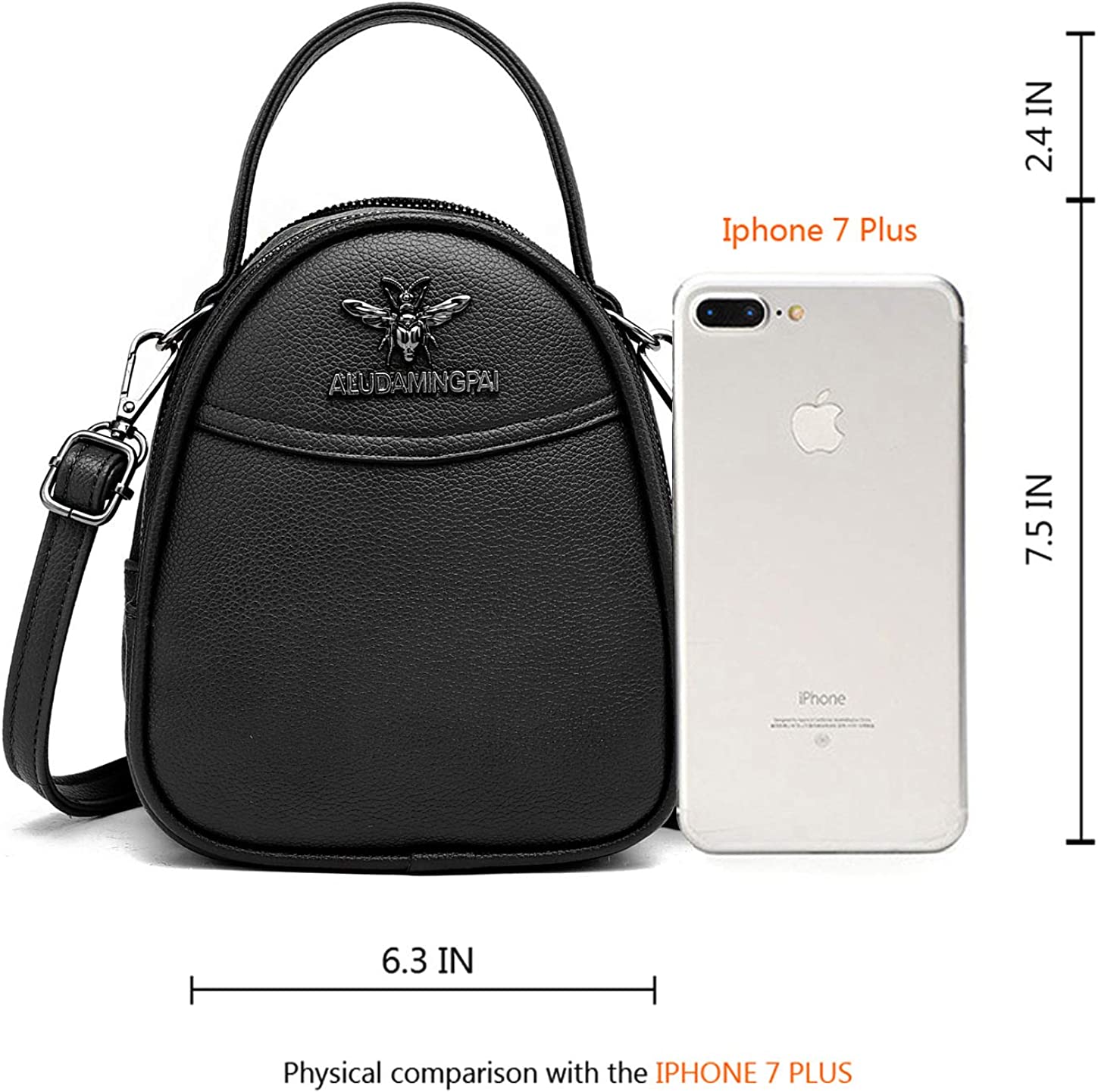• DIMENSIONS and INTERNAL: 6.3"L x 3.4"W x 7.5"H. Strap lenth: 46 IN. Multi Zipper Pocket Crossbody Bag, Total 3 zipper pockets.This cell phone main pocket will fit will fit the following phones; Apple iphone X, 8, 8 plus ,7, 7 plus,6S, 6S plus; Samsung Galaxy Note 8, Note 7, Note 5, Galaxy S5, S6, S7, S8, S9, Google Pixel XL plus more.