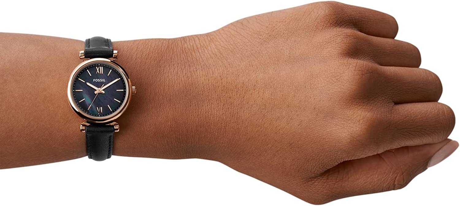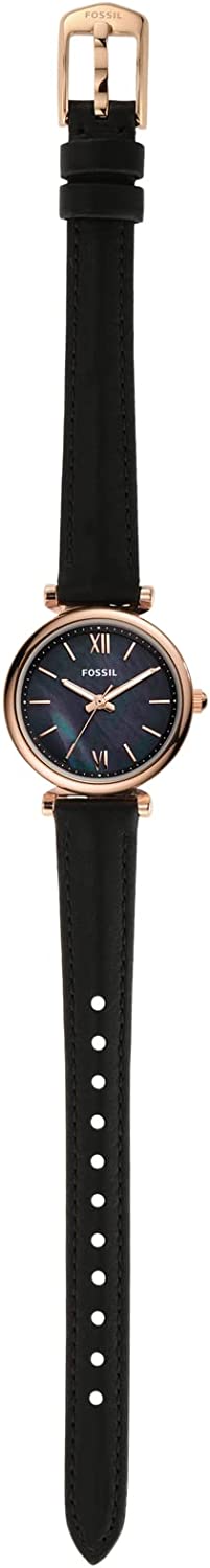 - Rose gold-tone stainless steel case with black mother of pearl dial; genuine black leather band with adjustable buckle closure; interchangeable with all 12mm Fossil straps