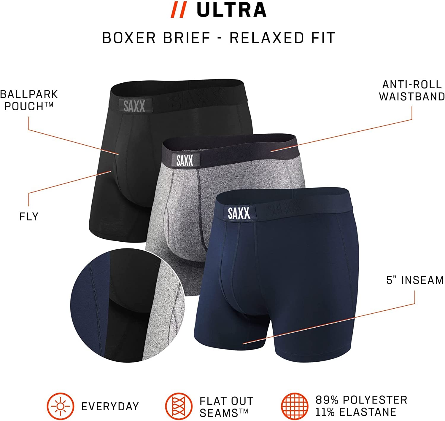 SAXX Men's Underwear - Ultra Super Soft Boxer Briefs with Fly and Built-in Pouch Support - Underwear for men, Pack of 3
