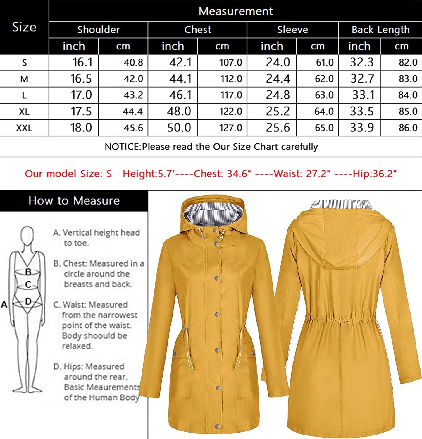 • 【Womens Raincoats Care】The raincoats are Dirt Proof, Wrinkle Resistance, Easy cleaning. Be attention, Hand-Wash, Dry Clean, Do Not Machine Wash. Machine wash easily damage the waterproof fabric.