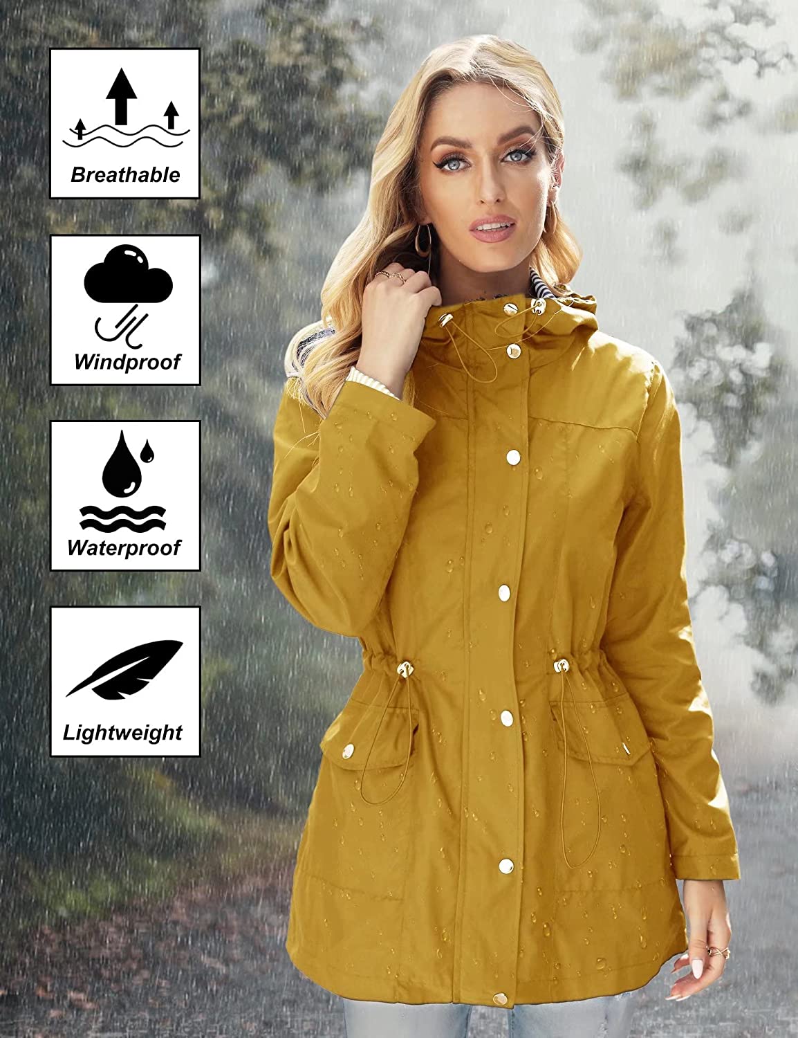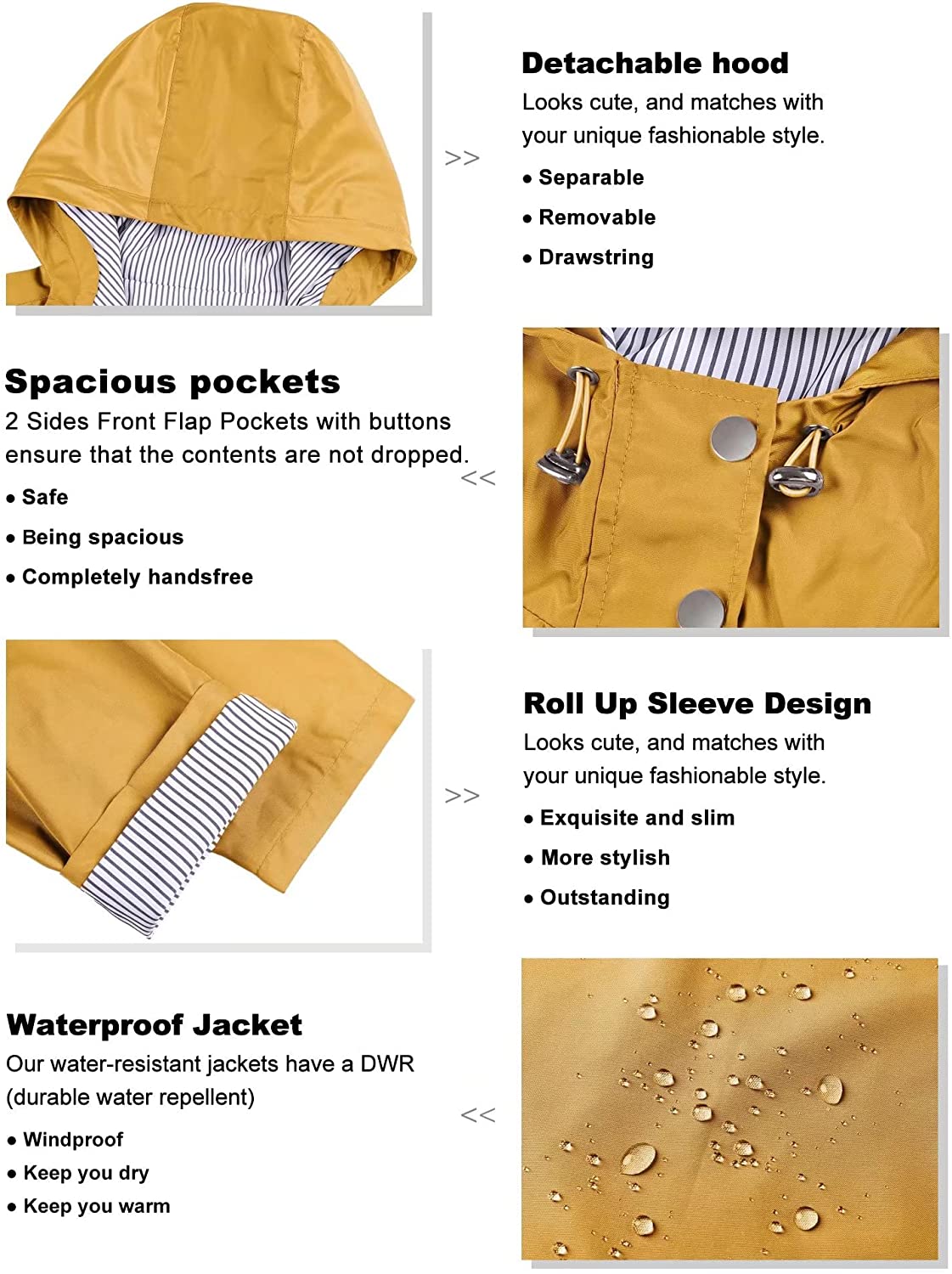 • 【Lightweight Rain Jacket Make You Easy】 rain jackets for women waterproof are by design lightweight which is easy to be carried in your day pack and also reduces energy consumption in the body. perfect for trip or casual wear.