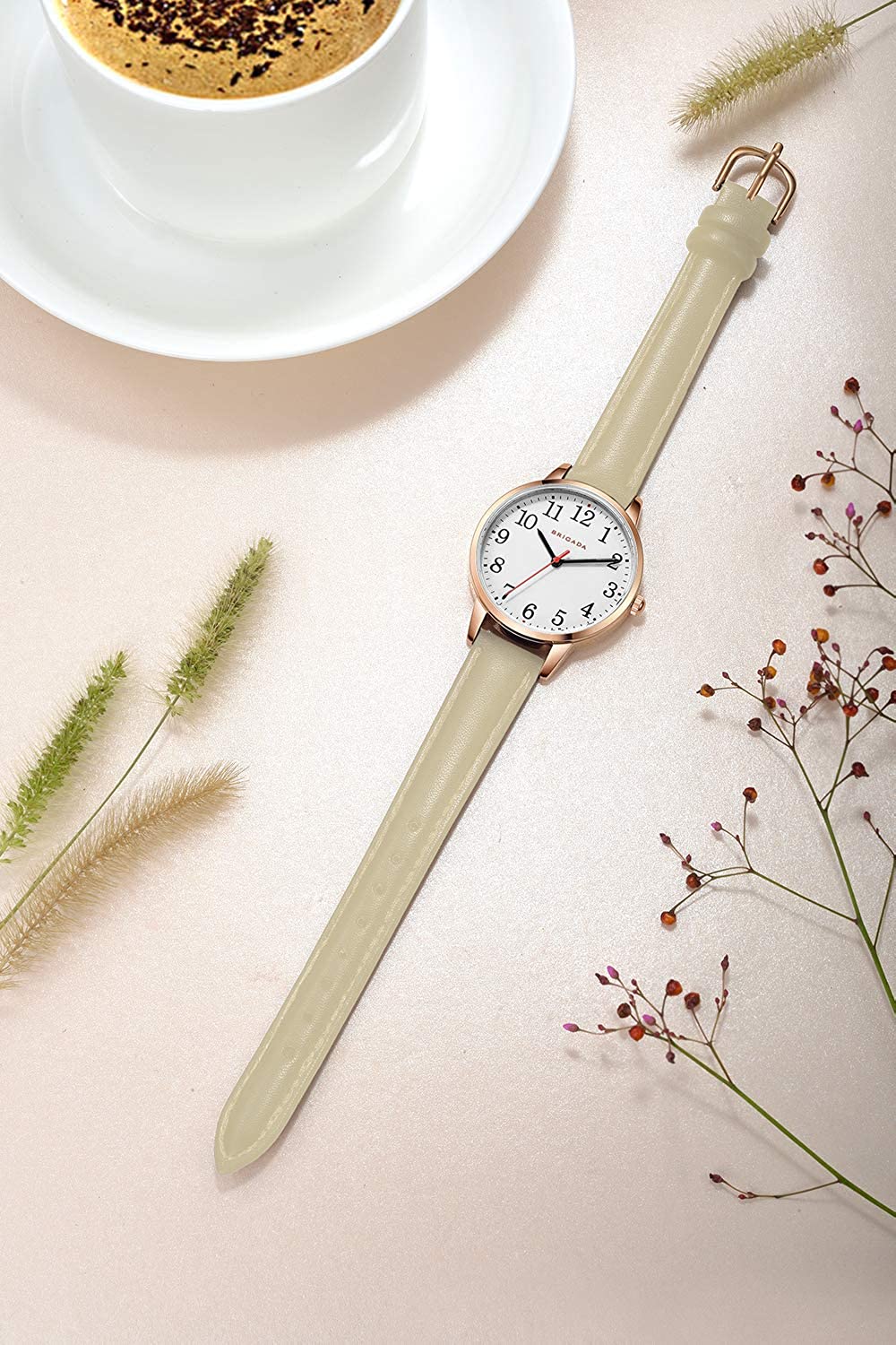• ❤Round white dial with legible Arabic numeral scale make the timepiece keeping good time. Red second hand is elegant and eye-catching, rose gold case comes with soft and wear-resistant beige watch band, love at first sight.