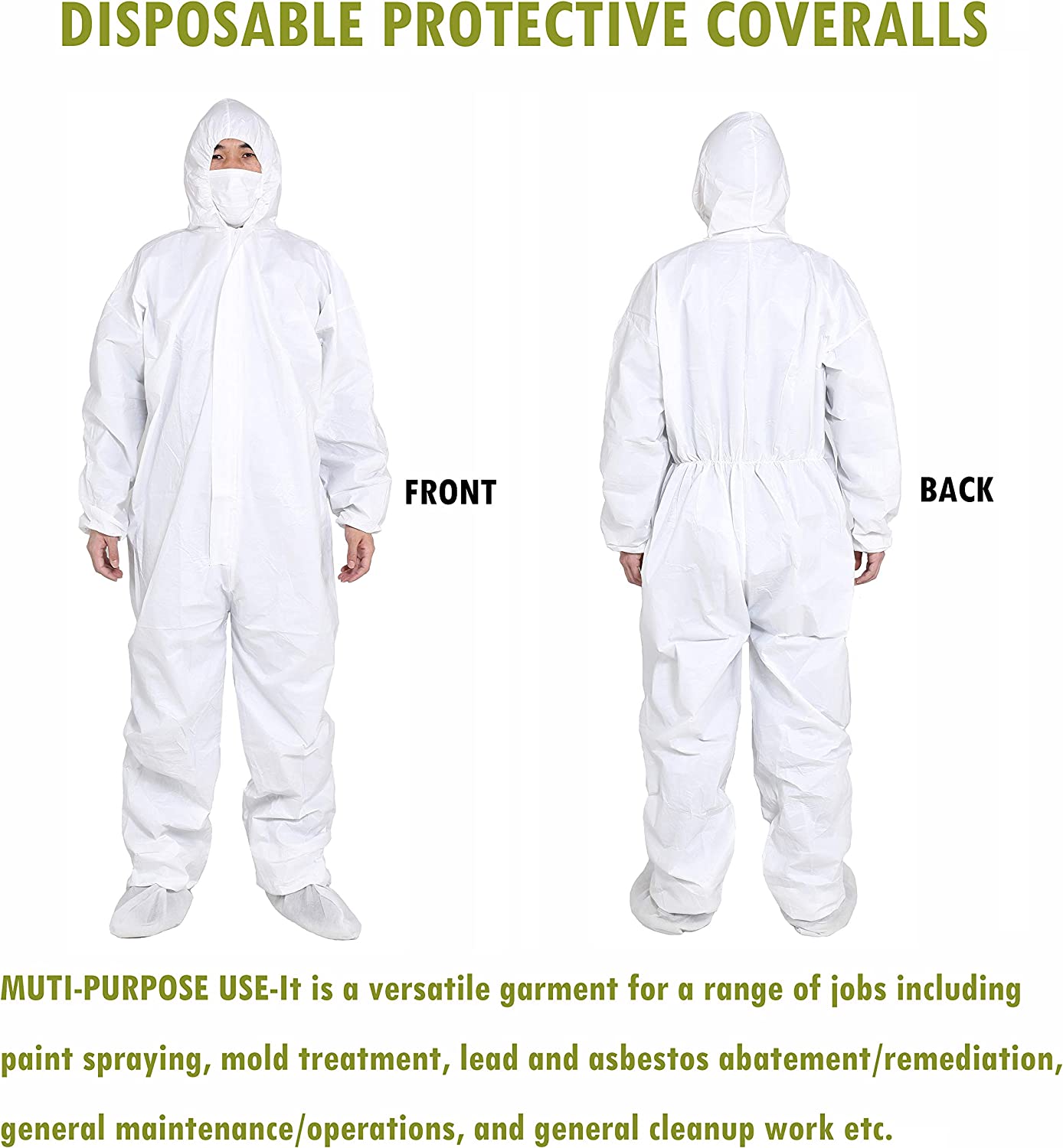 ▷MUTI-PURPOSE USE-It is a versatile garment for a range of jobs including paint spraying, fumigation work,mold treatment, lead and asbestos abatement/remediation, general maintenance/operations, and general cleanup work etc.Not for chemical resistant.