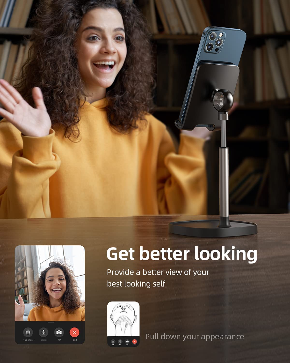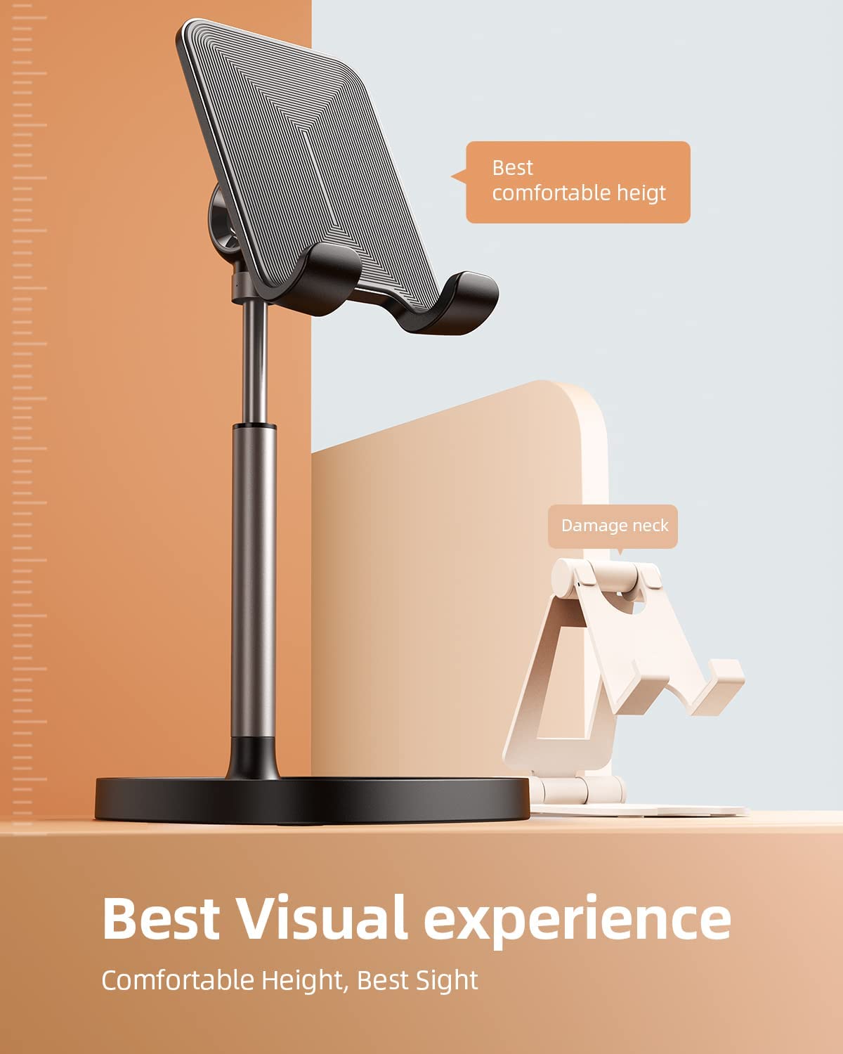 - TALLER AND MORE PHOTOGENIC STAND, HELP TO CORRECT THE "TEXT NECK": This cell phone stand holder is in accordance with ergonomic design. Providing you comfortable viewing angle which helps to fix your posture and reduce neck & back strain. The height can be easily adjusted between 7.1in-8.5in(1.4in adjustable range), the angle is adjustable between 5°~85°