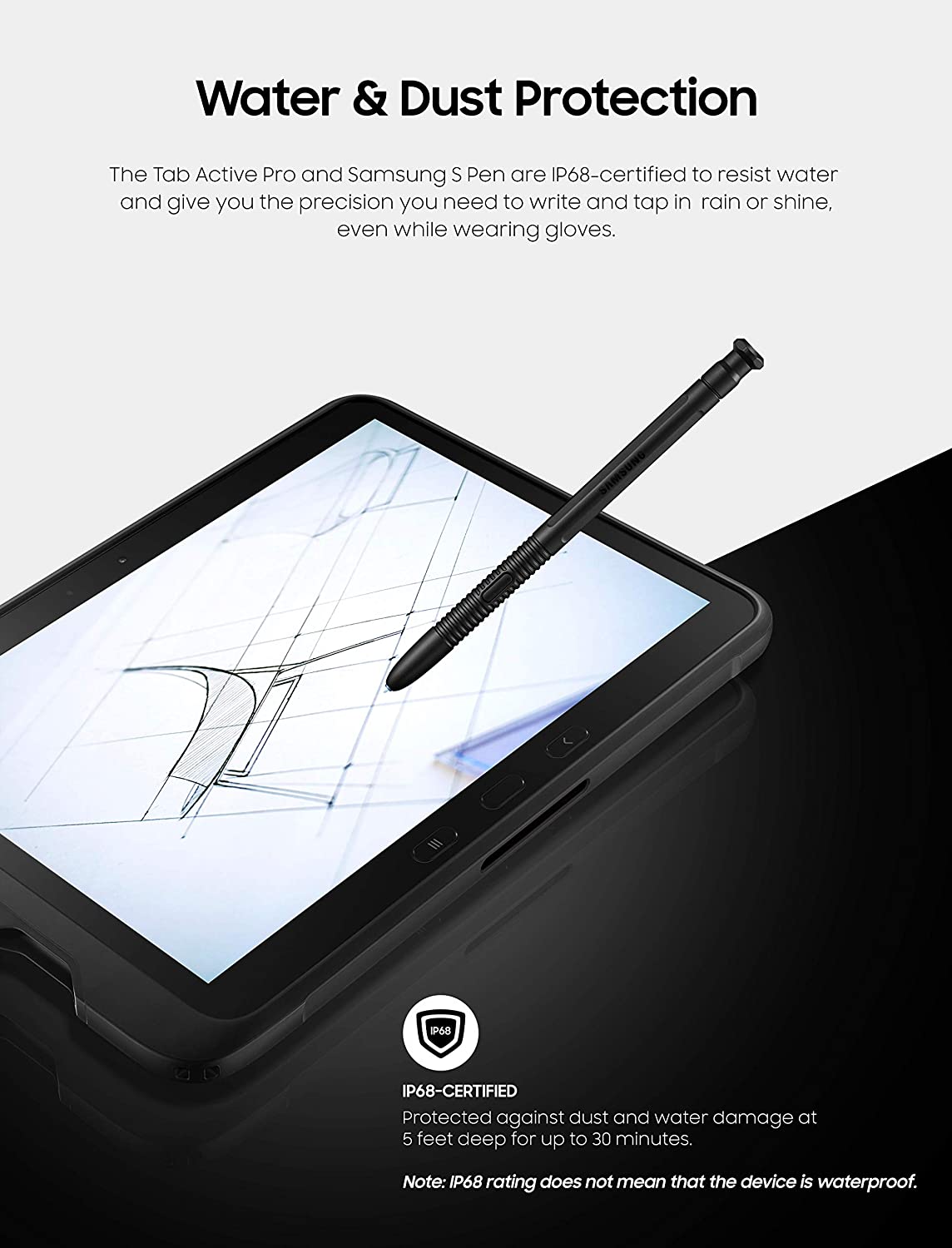 Built to withstand rough weather conditions with military-grade defense, the Samsung Galaxy Tab Active Pro tablet is designed to help you achieve the best industrial performance. The Galaxy Tab Active Pro is MIL-STD-810G and IP68-certified - tough enough.