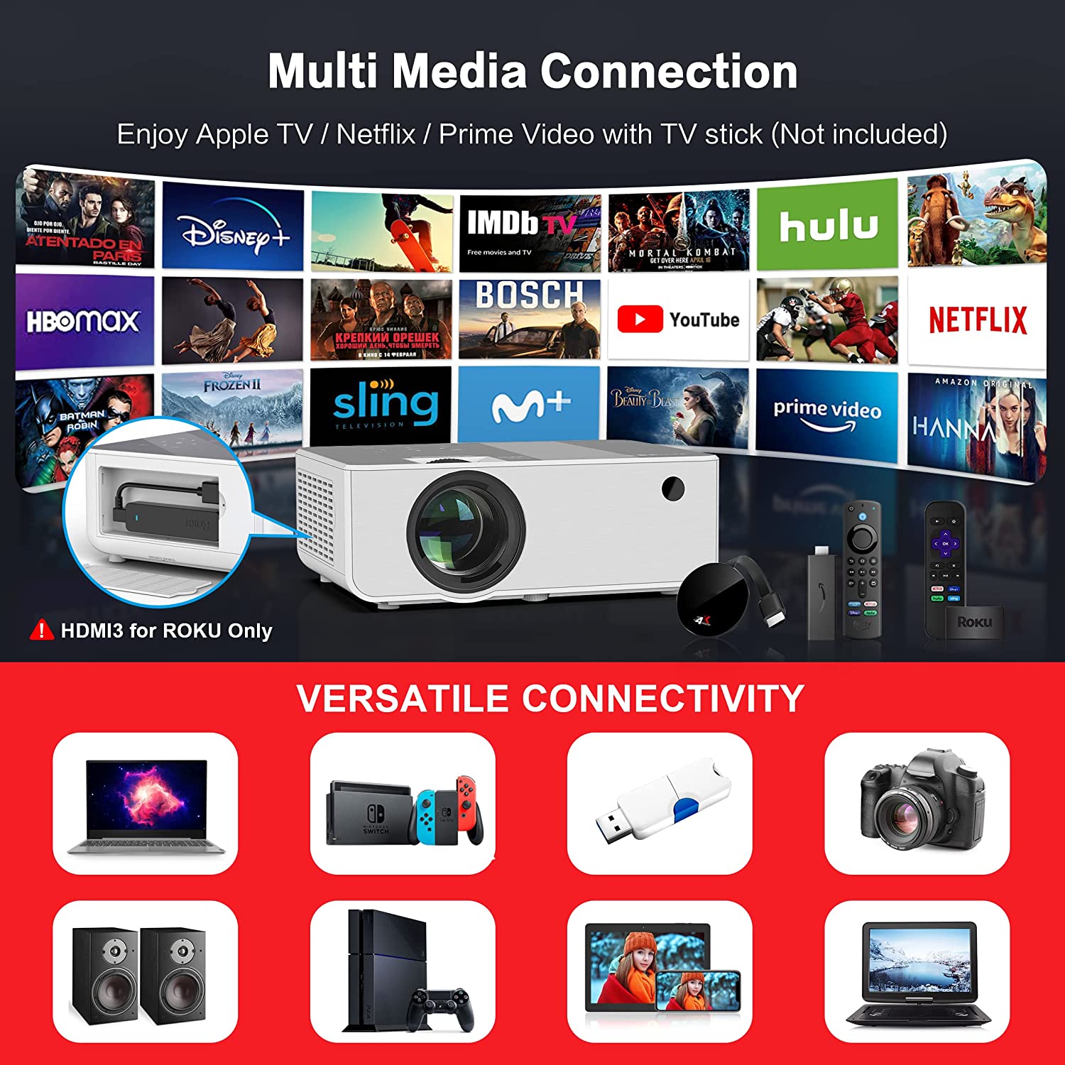 • You can use a TV Stick or Roku Stick to connect the projector to watch the connect from Netflix, Hulu and similar services