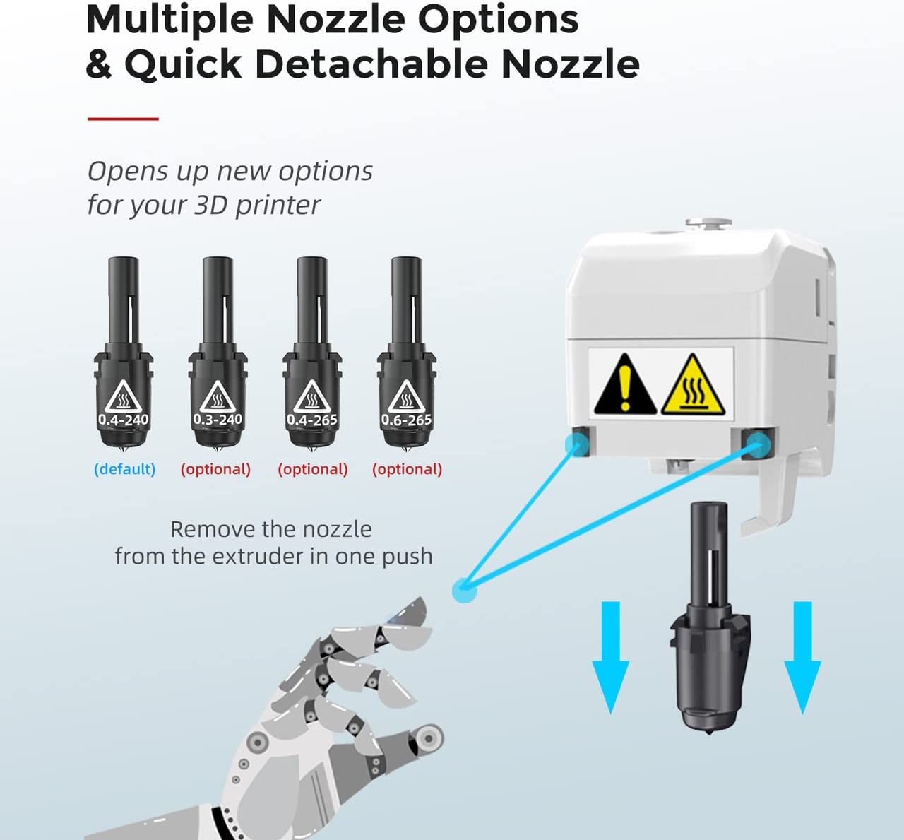 • 【New Quick Detachable Nozzle】– loading more smoothly with new nozzle and more compatible with third-party filaments. Remove the nozzle from extruder just in one push; Stainless steel tube material; Nozzle fast heated to 240°C in 50 seconds.If you need to print high-temperature filaments, you could purchase additional a 0.3, 0.4, 0.6mm 265℃ nozzle.