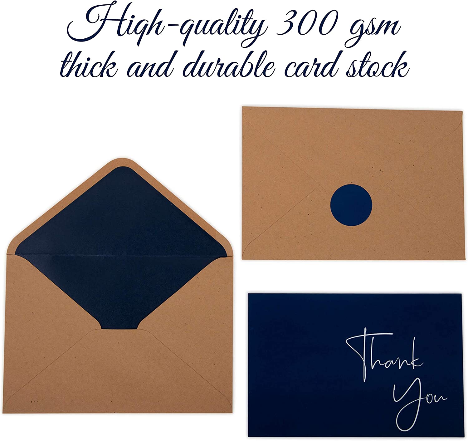 - ✔️ CLASSY DESIGN FOR ANY OCCASION: Each box set of 100 thank you cards come with matching lick-to-seal sturdy kraft envelopes with a blue interior lining as well as a matching themed sticker to seal the envelope and tie it all together. Be sure to always have a pack of greeting cards on hand, whether you need to thank a friend, send a special note, or make some staff appreciation cards!