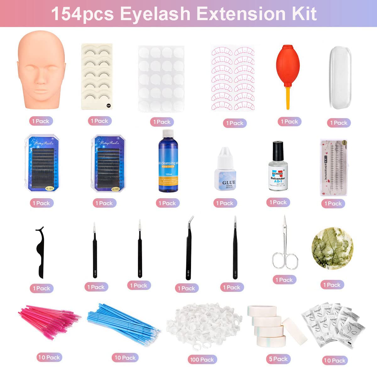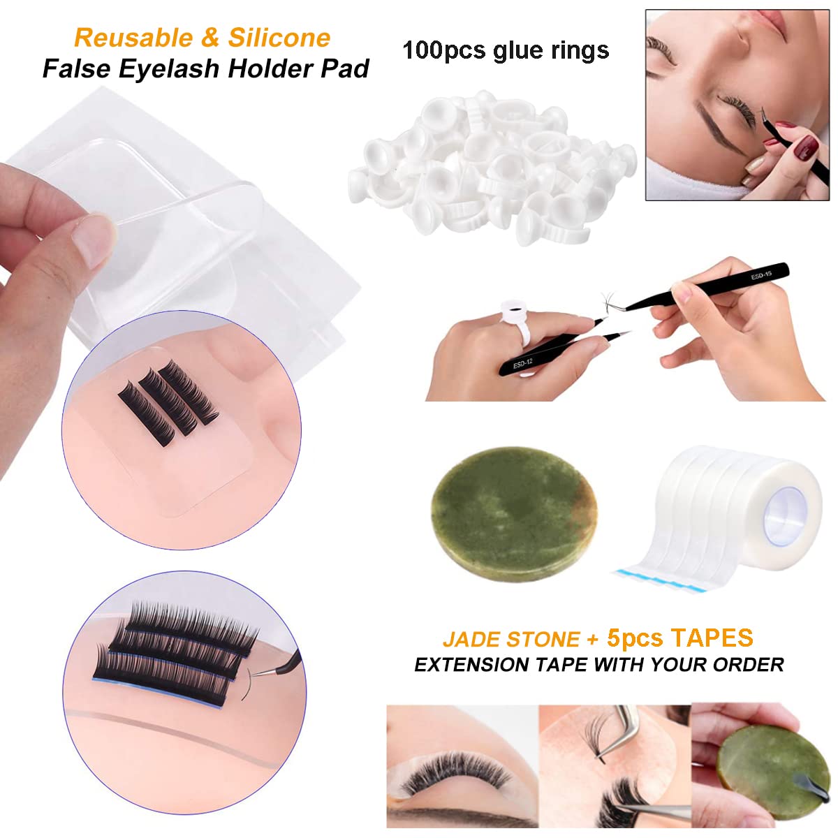 • EYELASH EXTENSION PRACTICE KIT WITH EVERYTHING - This lash extension kit with everything is useful for beginners or anyone who has a growing interest in doing lashes. Mannequin head, practice lashes, lashes extension, lash brush, swab, tweezers, eyelash gel patch, glue, glue remover, eyelash tape, eyelash cleansing solution, silicone pad, glue stickers, jade stone, air puffer blower, scissors, lash positioning stickers and glue rings.
