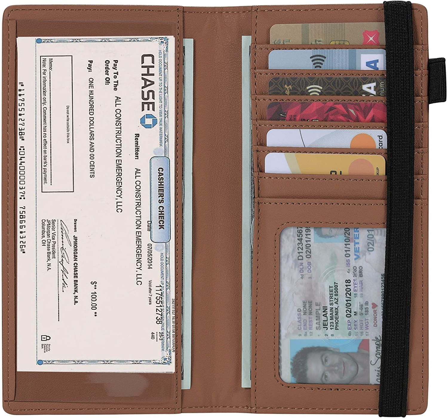 • FUNCTIONAL DESIGN: one checkbook holder, one plastic checkbook divider, 7 card slots, one pen holder, one elastic band to keep the checkbook holder closed.