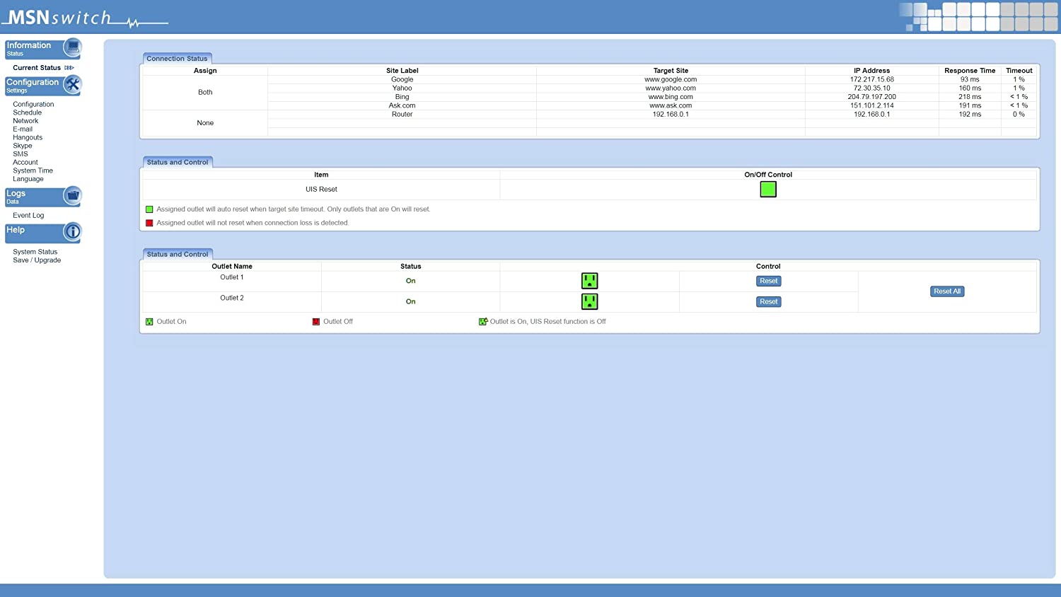 MSNSwitch Internet Enabled IP Remote Power Switch with Reboot - Control via Smartphone App, Cloud Service, Web Browser, Skype or Hangouts - 2 Independent AC Power Outlets (Model UIS-622b)
