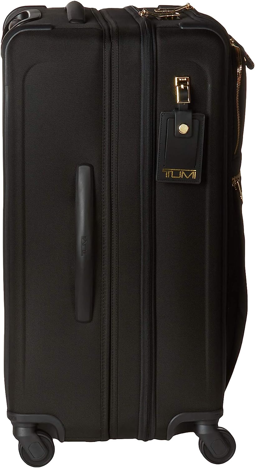 • Exterior Features: Split case zip entry to main compartment with security zipper, Large front U-zip pocket with security zipper, Front U-zip pocket, Gusseted front straight-zip pocket, Retractable top and side grab handles, Bottom grab handle, 3-stage telescoping handle, 4 dual spinner wheels, Molded impact-resistant side panels, Protective bumper rails, Built-in TSA combination lock, TUMI Tracer