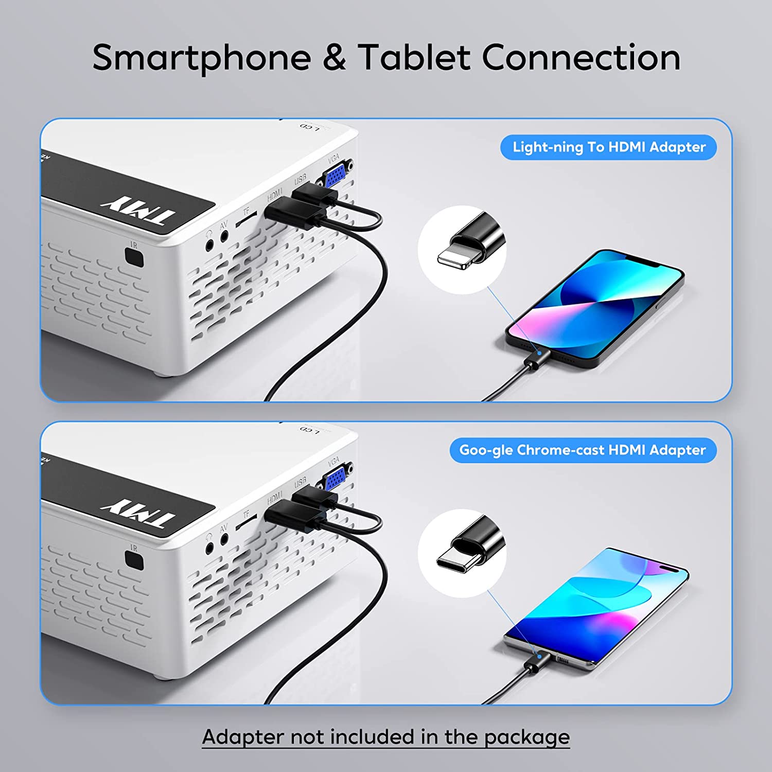 【?Extensive Connection Availability?】With the built-in HDMI, VGA, AV, USB, 3.5mm headphone port & TF card slot, plus included AV & HDMI cables, this portable projector is the perfect solution for a wide variety of input sources including but not limited to TV Stick/Box, Game Consoles, PCs, Smartphones, Tablets, Laptops, DVD players, TF cards and USB flash drives. Our V08 phone projector with 100" screen is easy to use and provides a great value.