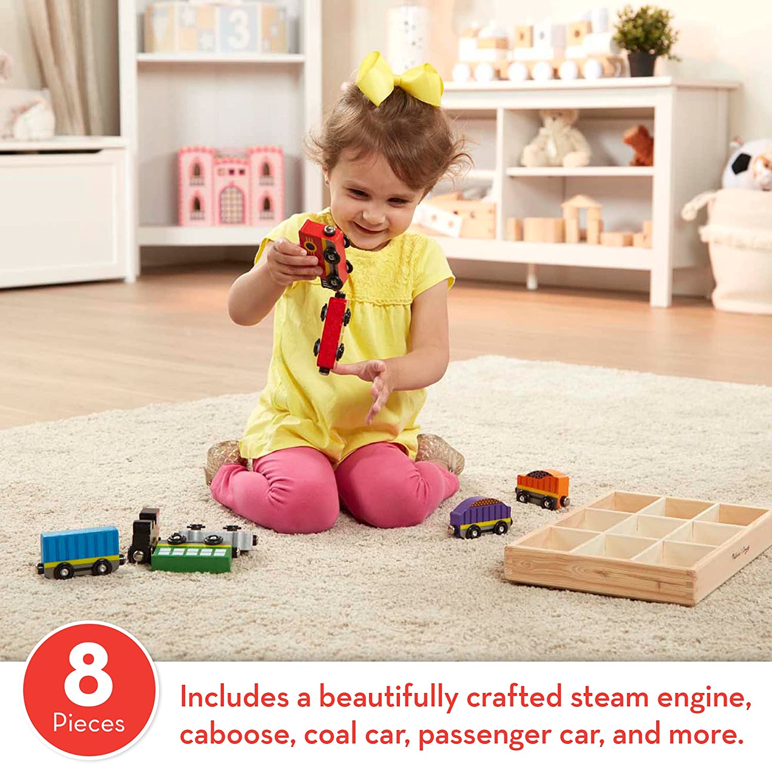 All aboard for some railroad adventures! Eight wooden train cars, each approximately three inches long, link together with magnetic couplers in endless combinations for lots of imaginative play. Brightly painted and beautifully crafted train cars include a steam engine, caboose, coal car, passenger car, and more. This set is sized to play perfectly with Melissa & Doug activity rugs or on its own. Pieces all store neatly in the compartmentalized wooden tray. This Melissa & Doug wooden toy set is made from high-quality materials. The sturdy train cars set provides unloading fun, and it’s easy for younger kids to use. Magnetic couplers link the cars together smoothly, making this a great toy set for building fine-motor skills and hand-eye coordination. This set makes a great gift for kids ages 3 years old and up, inspiring hours of hands-on, screen-free play. The Melissa & Doug Round the Rails Train Rug is a great add-on to give kids a dedicated space for imaginative play. For more than 30 years, Melissa & Doug has created beautifully designed imagination- and creativity-sparking products that NBC News called “the gold standard in early childhood play.” Today, Melissa & Doug is proudly partnering with the American Academy of Pediatrics to foster early brain development and help children build important life skills through play.
