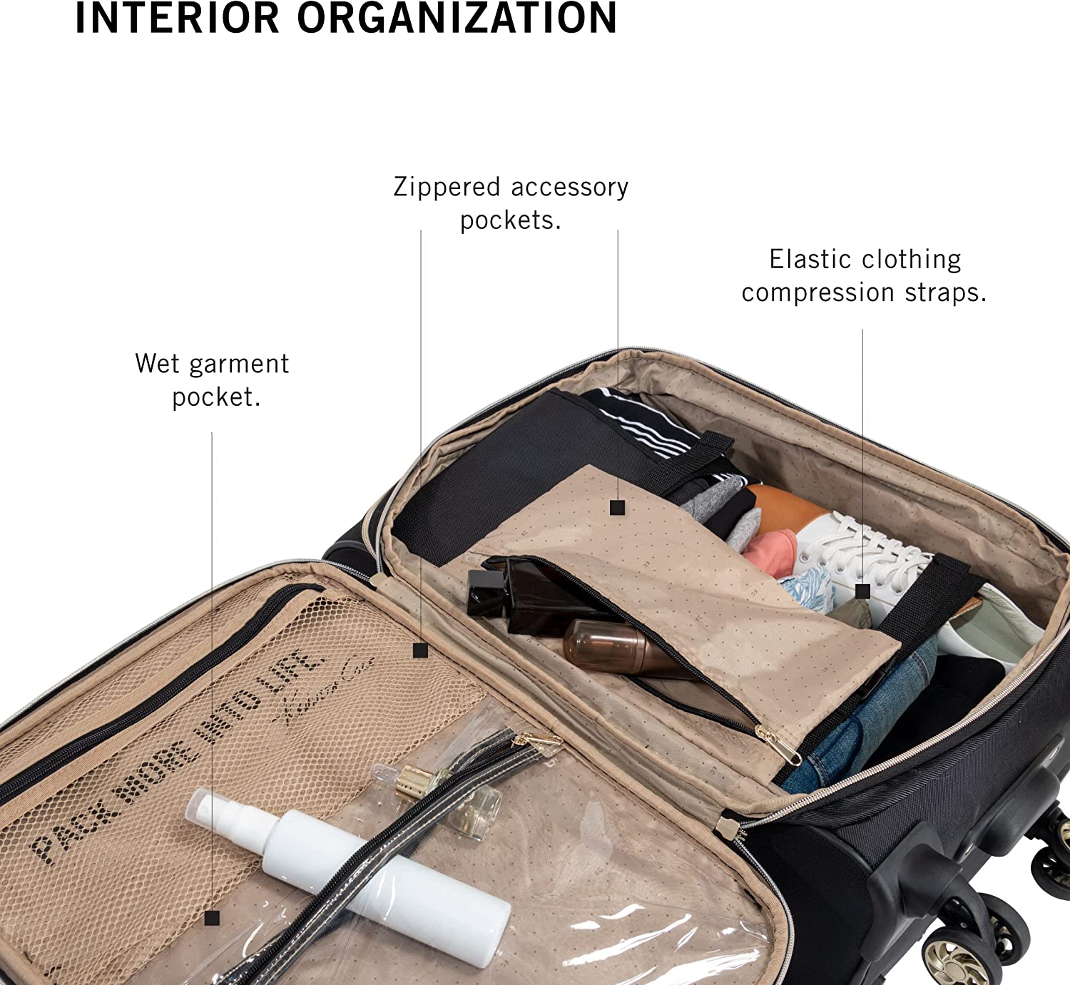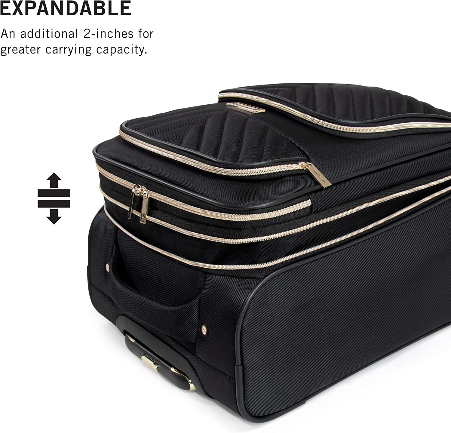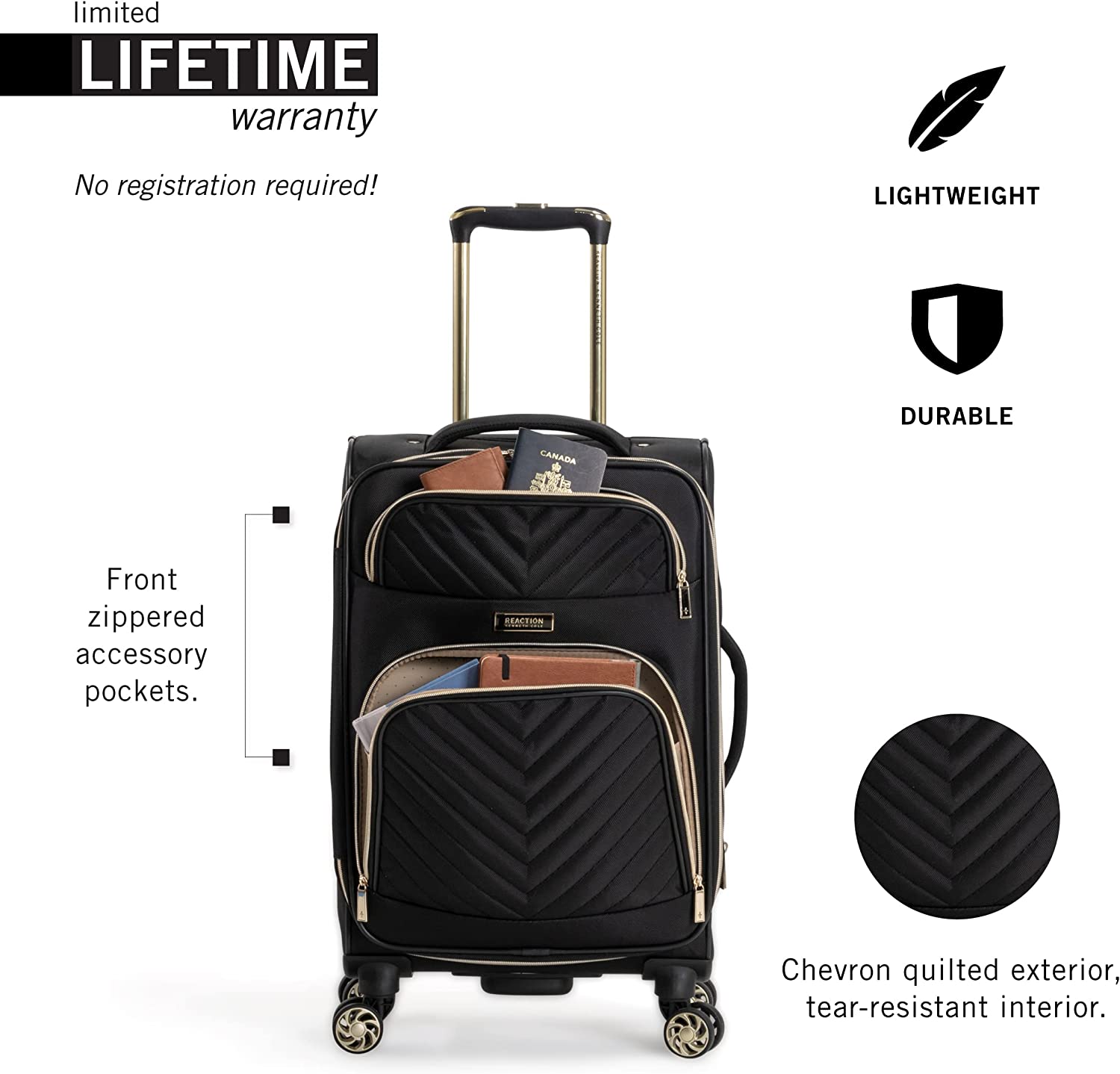 Finally, travel made trendy with the stylish polyester-twill chevron luggage from Kenneth Cole Reaction’s Chelsea luggage collection. Complete with a fully lined, tear-resistant interior, this luggage also expands an additional 2.0 inches, ensuring that you have plenty of space for all your needed belongings. Its lightweight construction helps you meet airline weight restrictions to avoid unnecessary airport fees, while its 8-wheel spinners provide effortless 360-degree navigation allowing you to glide quickly through the airport. The main compartment interior features a hanging side zipper pocket and garment restraints to hold belongings in place. The under-the-lid section includes a mesh zipper pocket and a transparent, clear PEVA gusseted pocket for toiletries. The front exterior also features a small zipper pocket for easily accessible items and a large gusseted zipper pocket for additional storage organization. Padded top and side handles allow for easy maneuvering, and a bottom grab handle allows for easier lifting. Additionally, a retractable trolley handle extends to be 41 inches tall with a locking push button mechanism. Fashionable and functional, Chelsea luggage also boasts fashion-forward gold hardware with premium self-repairing coil zippers designed for long-lasting use. Carry-on size meets most U.S. based airline carry-on size requirements and fits into most airline overhead bin compartments. Backed by a manufacturer 10-year limited warranty. ★ Overall Dimensions: 22.0” H” x 14.0” L x 9.0”-11.0” D. ★ Packing Dimensions: 20.0” H x 13.5” L x 8.5”-10.5” D. ★ Weight: 6.35 lbs. ★