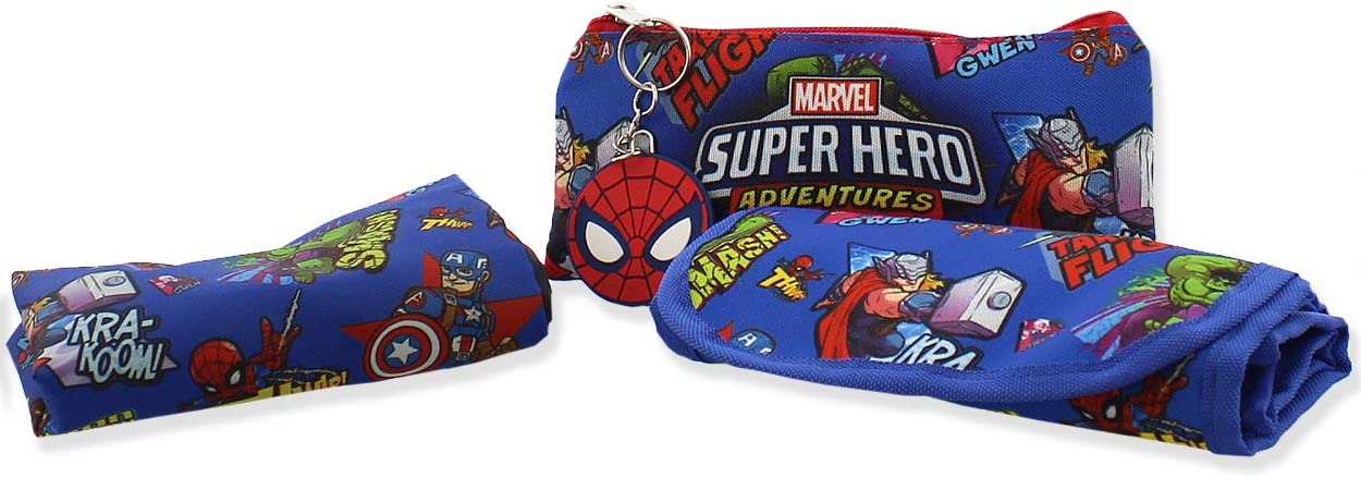 5-PIECE SUPER HERO ADVENTURES BOYS BACKPACK SET - This 5-piece Marvel Super Hero backpack and snack bag set is a great value. Included in this set is a stylish 16 inch backpack, a fold-able snack bag, a soft utility pencil case, a cool drawstring sack, and a Spider-Man Circle Logo Rubber Keychain. This matching set is the perfect back-to-school set at a very affordable price.?This backpack measures approximately 16" X 12" X 4". MULTIPLE COMPARTMENTS TO KEEP THINGS ORGANIZED - This Marvel Super Hero backpack school set helps your child keep organized throughout the day. The book bag contains a large main zip compartment, and a front zip compartment that easily stores pencils, and other supplies! Store a water bottle in the side pockets, snacks in the fold-able snack bag, and smaller items in utility pencil case.? WELL CONSTRUCTED AND COMFORTABLE - This quality book bag can be hung up when not in use by the? webbed locker loop. This school bag is designed in durable fabric with adjustable shoulder straps. The length of the shoulder straps is adjustable for the perfect fit. The side mesh pockets are made from athletic mesh for extra durability. FUN AND STYLISH - This book bag school set features your favorite Marvel Super Hero Adventures characters: Spider-Man, Thor, Ironman, Hulk, Black Widow and Captain America! It's the perfect travel, school, or camp set for any Marvel fan! THE PERFECT GIFT! - Marvel Super Hero Adventures school supplies sets make the perfect back-to-school, birthday, or Christmas gift. Why? They are well constructed, feature awesome Marvel characters, and are very affordable. It's the perfect backpack set for a day at camp, back-to-school, or for travel! If you love Marvel Super Hero Adventures, this set is for you!