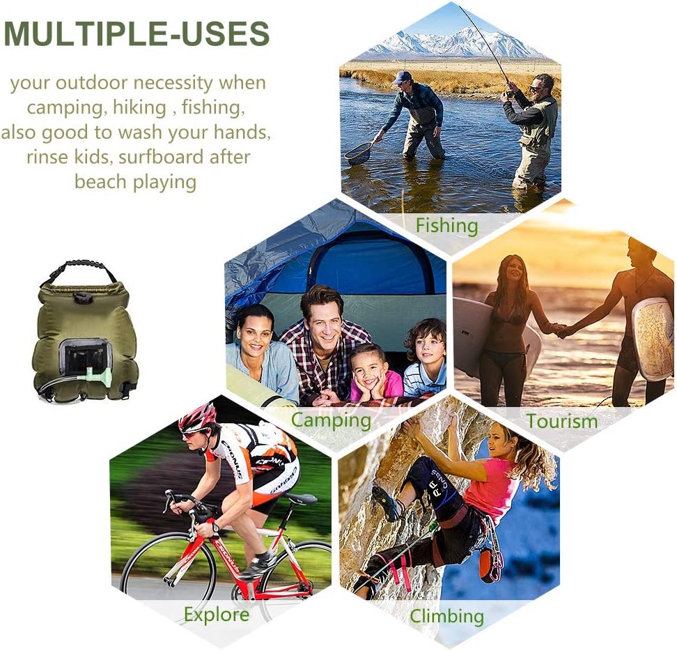 Features :All bag materials are Environmental FriendlyWater capacity of 5 gallons (20 liters) Use solar energy to heat water to 45°C (113°F) in few hoursTemperature indicator (°C/°F) for water temperatureFlexible hose & shower head includedAdvanced shower head : ON/OFF switch & switchable from LOW to HIGH water currentLight weight & foldable, easy for carry & storage