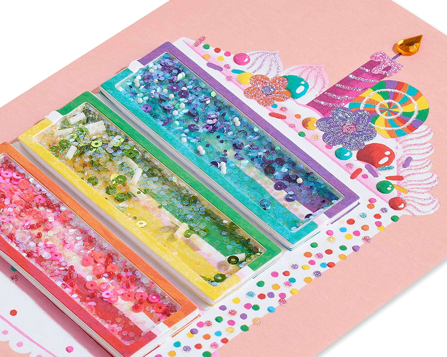 Hooray for birthdays! Three cheers – one for each layer of fun on this bright and celebratory birthday card by Papyrus. A big piece of cake takes center stage on this colorful design with lots of extra embellishments like glitter, embossing, gems, sequins and beads secured behind a clear plastic overlay, and dimensional paper attachments. Like the perfect birthday, it’s a little over the top in all the best ways, and it’s fun to send to anyone who deserves some bigtime birthday cheer. Includes lavender envelope with colorful polka dot lining and a classic gold seal. Extra postage is required.