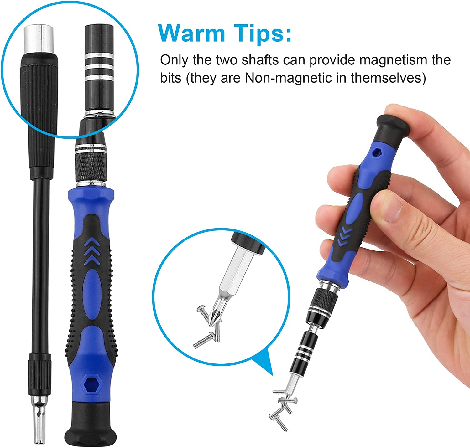 【Humanized Design】Ergonomic and press & push design handle, it is comfortable to hold even for the long-time use. Flexible Shaft Extension Rod and Solid Shaft Extension Rod with STRONG magnetic tips makes it easy to fix bit and pull screws out, a flexible shaft included is perfect for electronics where the shaft is hard to get, ideal for stereo work.