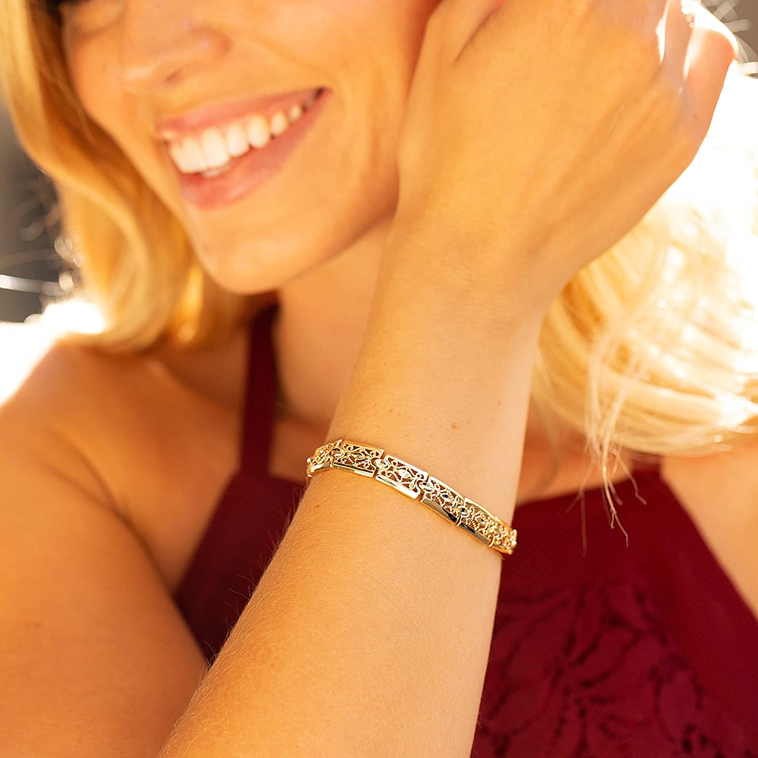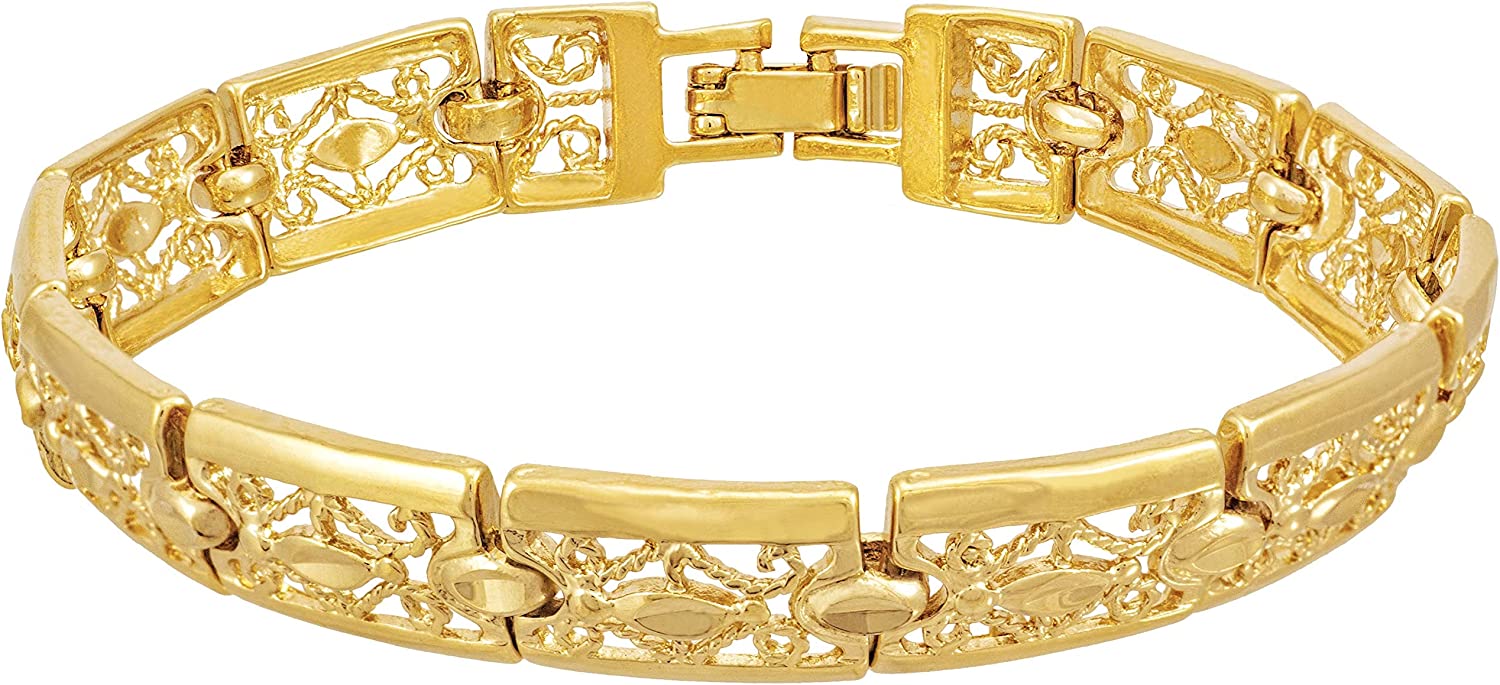 ? This 9mm ( ~ 3/8 inch ) Filigree Bracelet for women is MADE TO LAST with up to 20X more 24 karat gold plating than other electroplated fashion jewelry; This elegant bracelet makes a statement with its intricate and delicate design; Choice of yellow or white gold (rhodium)
