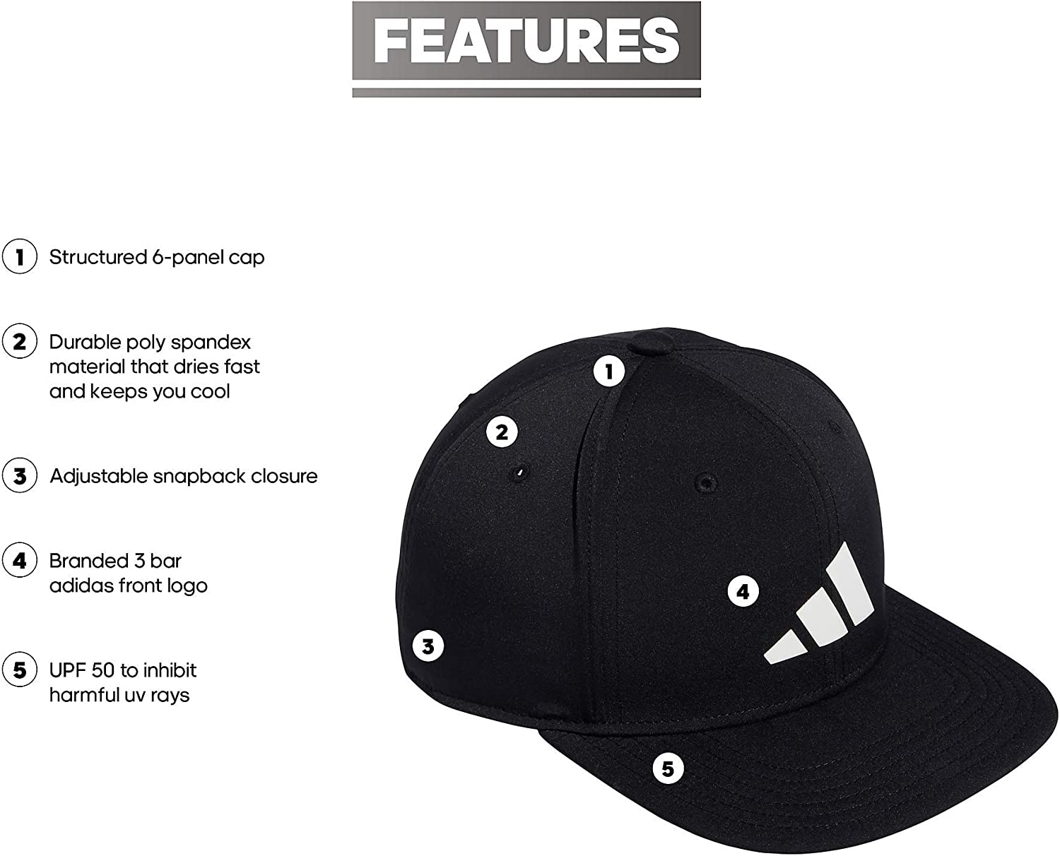 - Structured 6-panel cap with adjustable snapback closure.