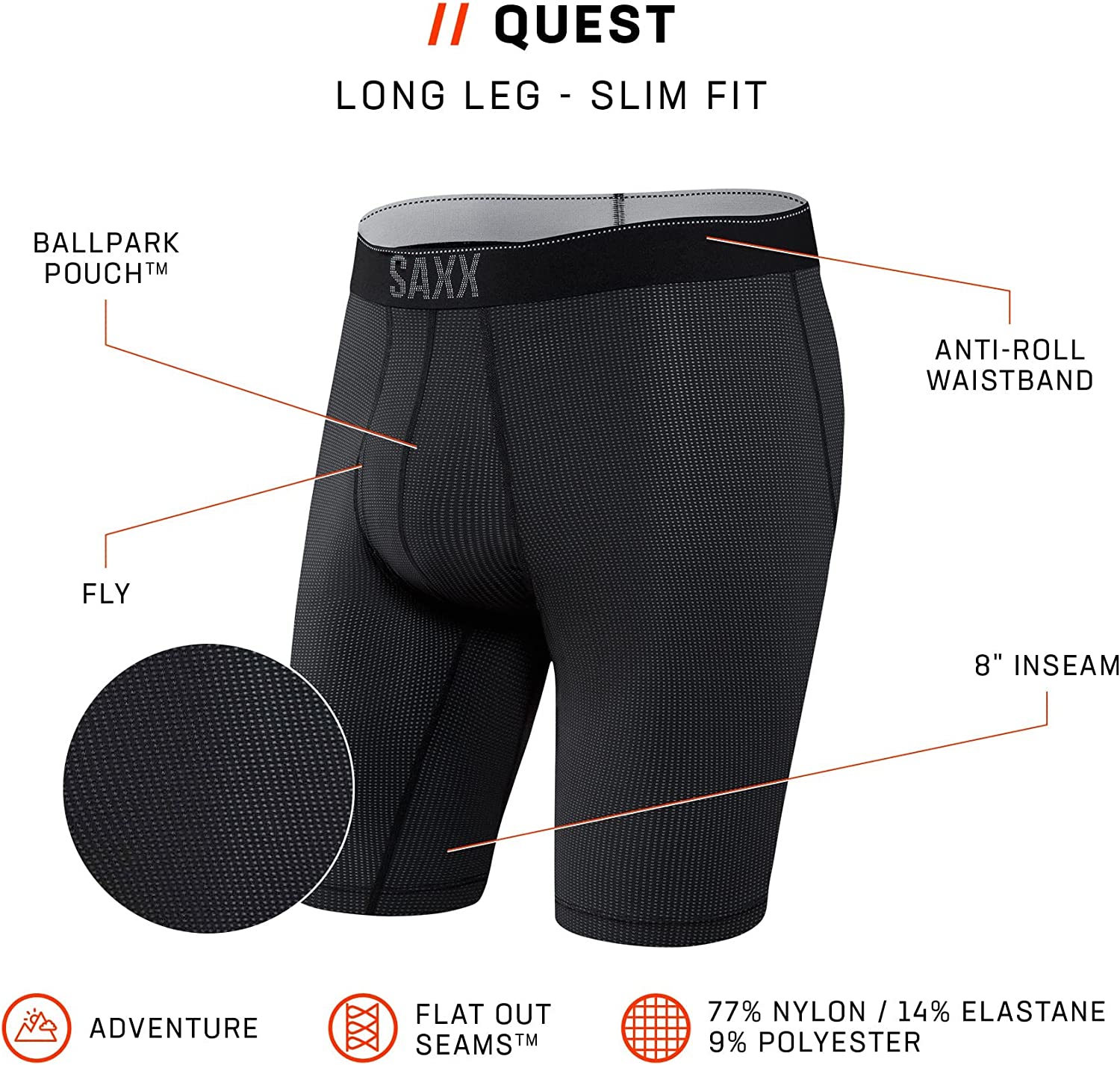 Quest Long Leg Boxer Briefs - Our Quest Long Leg Boxers are perfect for all your travel adventures. Featuring a slim fit and a fly, the Quest long boxer brief sits just above the knee with an 8" inseam. It's made from ultralight, quick-drying, pin-dot mesh fabric for wash-and-go wearability. The digitally printed graphic waistband adds personality to life on the road! BallPark Pouch - Each pair of our boxer briefs comes equipped with the BallPark Pouch. Designed to reduce friction while keeping everything supported and securely in place, this patented pouch technology features breathable fine mesh panels for chafe-free all day comfort. No Rubbing or Chafing - Quest Long Leg Boxer Briefs are constructed from our quick-dry fabric blend of moisture-wicking nylon, spandex, and polyester for all day comfort and support. Designed to keep moisture away from your skin and prevent chafing, the boxer briefs feature Flat Out Seams, which place the softer, flatter side of the underwear seam against skin. The boxer briefs have a Three-D Fit design which builds the underwear from nine panels around the thighs, hamstrings, quads and glutes to support every move you make. Take Action - Quest boxer briefs are an essential addition to any packing list. Pick up a pack of the soft and comfortable lightweight men’s boxer briefs and throw them in your backpack or suitcase – you’re good to go.