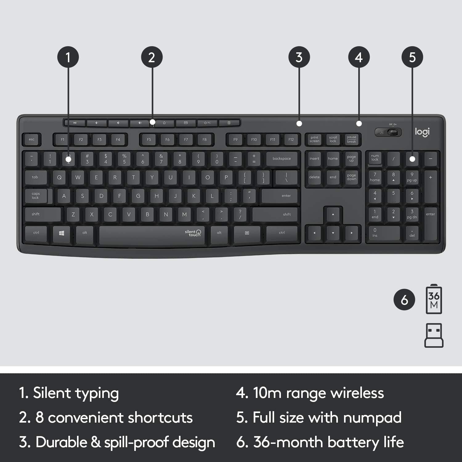 Strong reliable 2. 4 GHz wireless connection with 10m range and a tiny USB receiver for a clean, clutter free desk area