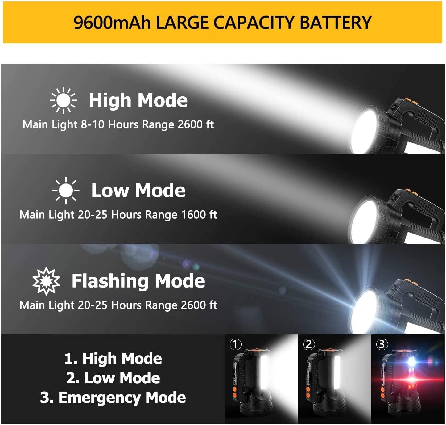 A HIGH-POWERFUL LIGHT WHERE YOU NEED IT MOST. Ultra-bright 40 Watt LED light with 2 brightness modes: High (6,000 lumens), Low (3000 lumens). Ultra-long illumination range up to 800 meters Makes it a long distance spotlight flashlight.Besides,it’s a powerful camping floodlight and warning light.