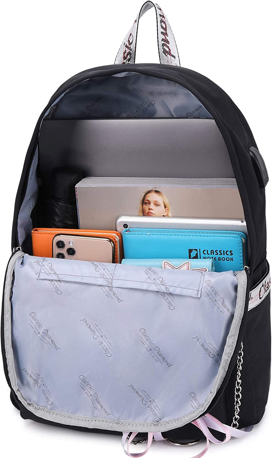 SCHOOL BAG with BUTTERFLY KNOT and CHAIN: The butterfly knot made of ribbon is our original design, which makes backpack look charming and beautiful when it is embellished on this pure black/pink/grey school bag. Chain design is fabulous, its decoration matching bow knot makes the backpack look more elegant and fashionable. You can graffiti your favorite pattern into the blank solid color space of backpack, which makes it more special.