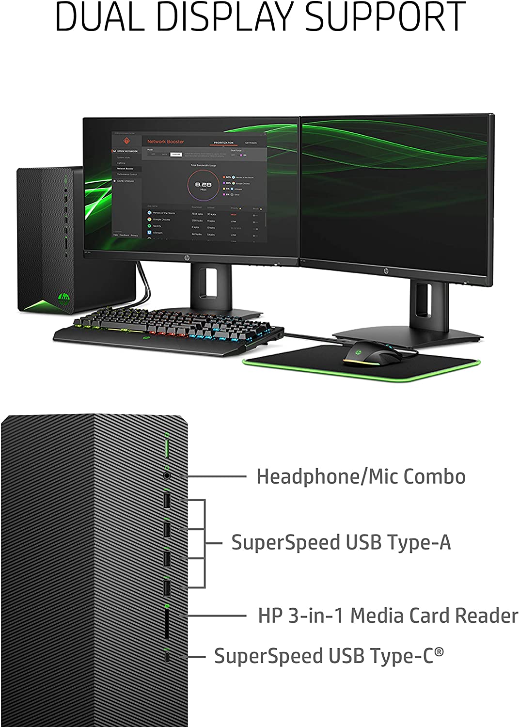 - PC GAMING CONNECTIVITY – Enjoy rock-solid connections with the latest Wi-Fi 5 (1x1) WLAN adapter and Bluetooth 4.2 as well as reliable external ports in the Headphone/Microphone combo, 5.1 surround sound, and SuperSpeed USB Type-A and Type-C ports; this pc is perfect for dual display support