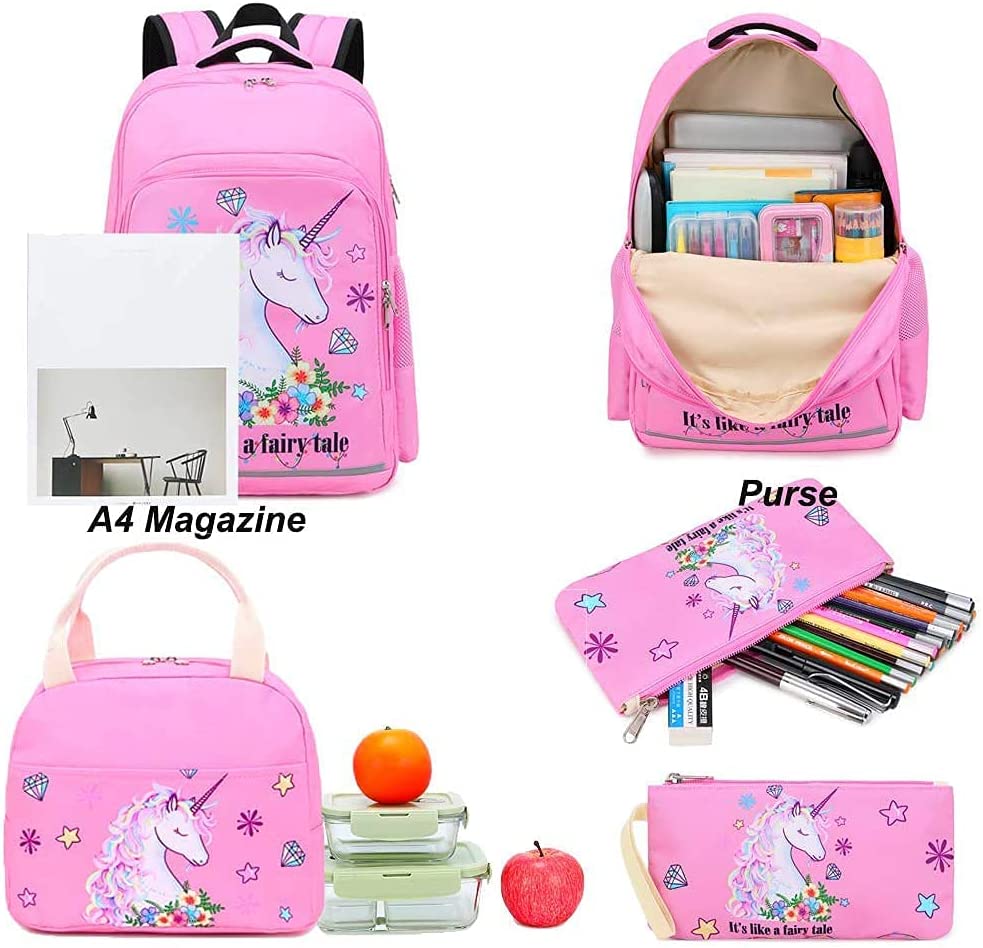 Material: This girl unicorn backpack is well made of high quality and durable Oxford with fairy tale unicorn printing, it would not fade. The 3 IN 1 kindergarten backpack set include girls Backpack + Insulated lunch tote Bag + Pencil pouch also as purse, perfect for girls to use at school days.