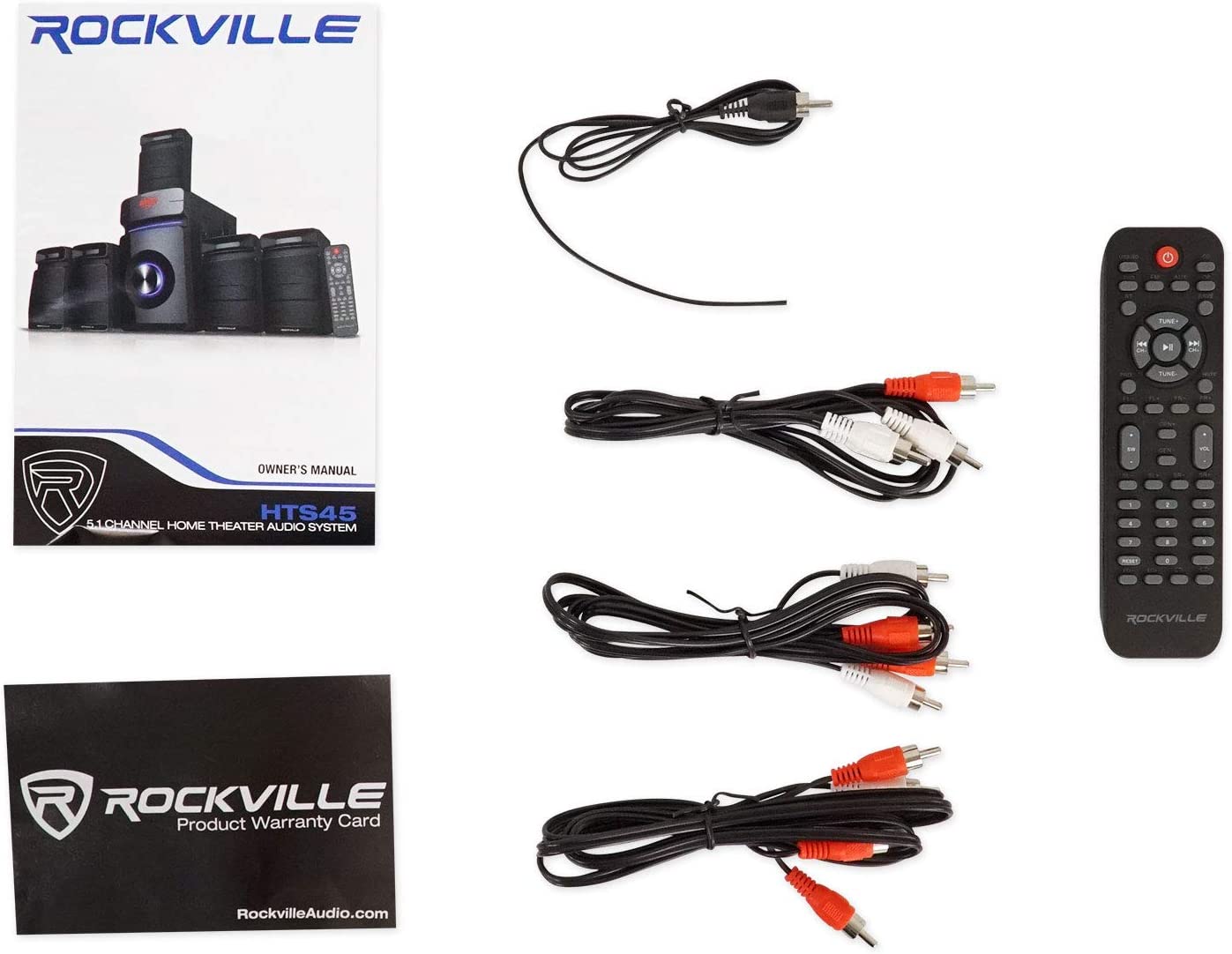 Rockville HTS45 800w 5.1 Channel Bluetooth Home Theater Audio System+Subwoofer. 800 Watts Peak Power. 400 Watts Program Power. 200 Watts Continuous RMS Power. 5.25” Subwoofer with Built-In Receiver. 3” Center Channel Speaker. 3” Full Range Front Speakers. 3” Full Range Rear Channel Speakers. Top Quality MDF Wood Cabinets with Plastic Front Panels. Built-In FM Receiver with Amazing Reception. 5 Preset Equalizer curves. You can independently control the volume of each speaker and the subwoofer. Bluetooth v5.0. Optical Input. Coaxial Input. USB Input (max file size 64Gb). SD Input (max file size 64Gb). 2 ¼” MIC Inputs with Echo function for karaoke. 5 RCA Audio Outputs connect to the 5 speakers