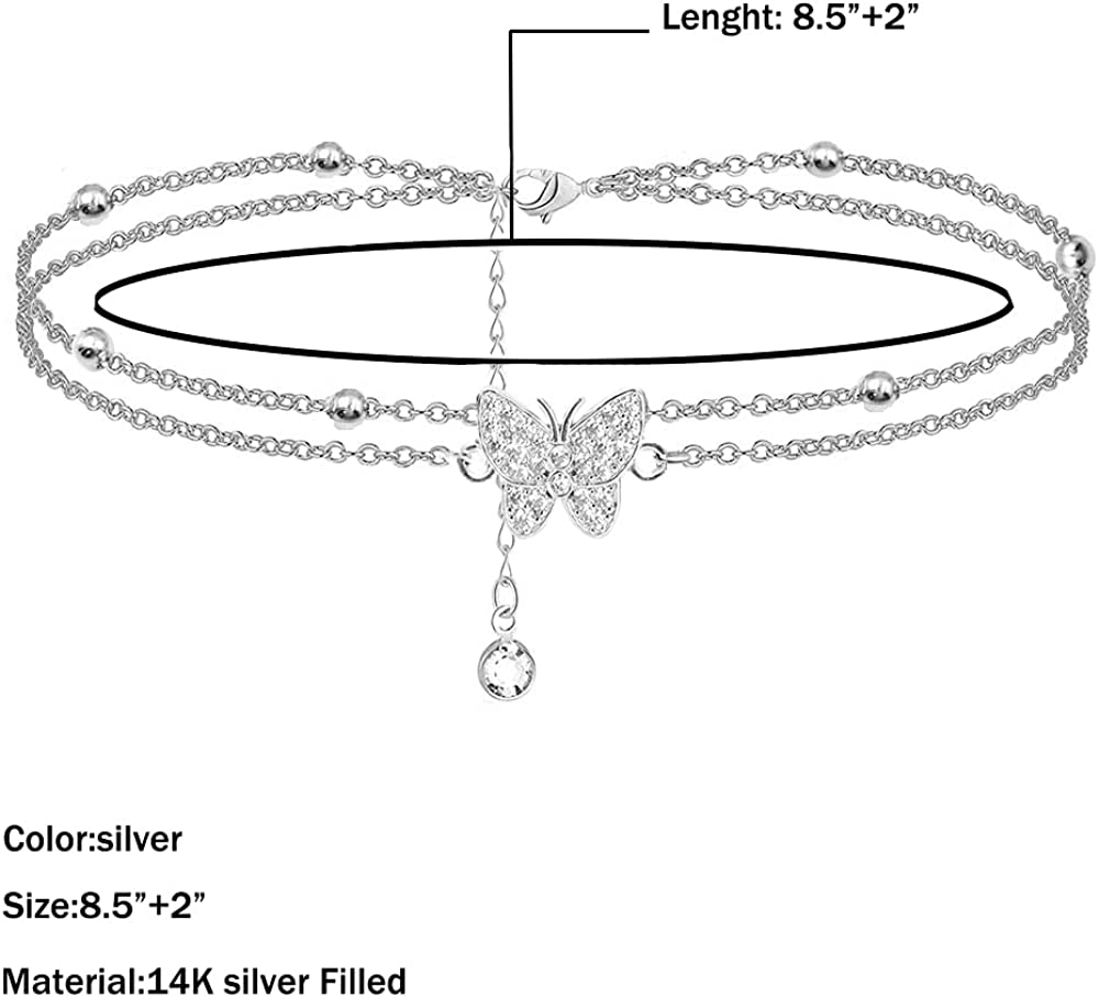 14K Butterfly Silver anklets for Women - Adjustable Layered Women's anklets - Jewelry Anklet Gifts for Women Teen Girls