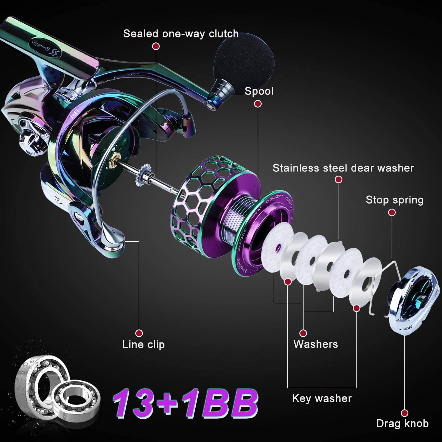 Sougayilang Colorful Fishing Reel 13 +1 BB Light Weight Ultra Smooth Powerful Spinning Reels, with CNC Line Management Graphite Frame, for Freshwater