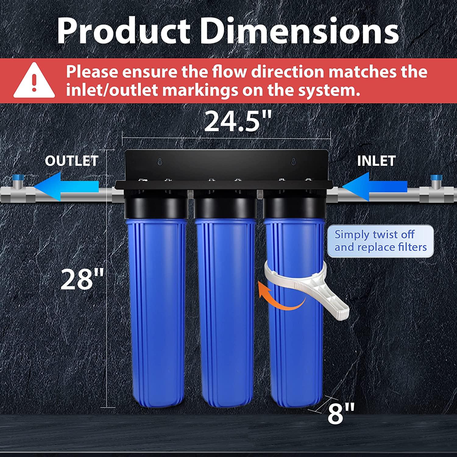 DIY installation and maintenance - refer to our manual and our helpful YouTube videos for easy DIY installation. With 1 in. NPT inlet / outlet and 20 in. x 4.5 in. water filter cartridges, WGB32BM whole home water filter system has minimum impact on water flow (up to 15 GPM) and requires minimum maintenance.