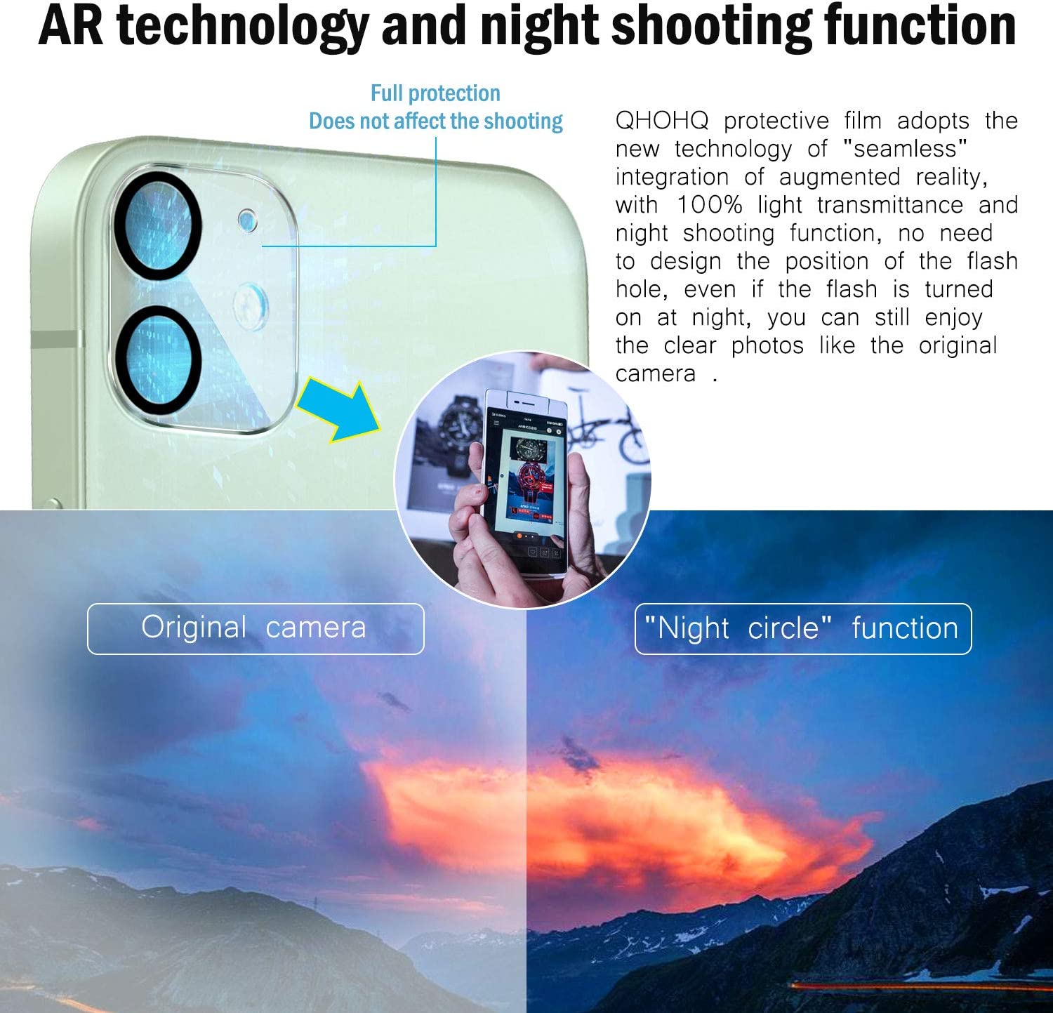 • AR technology and night shooting function: The glittering rear camera lens protector are designed for iPhone 12 6.1", using augmented reality "seamless" fusion new technology, with enhanced light transmission function. No need to design the flash hole position, even if the flash is turned on at night , it can be 99.99 % Guarantee the original quality of photos and videos.