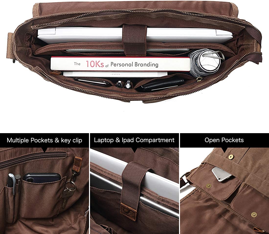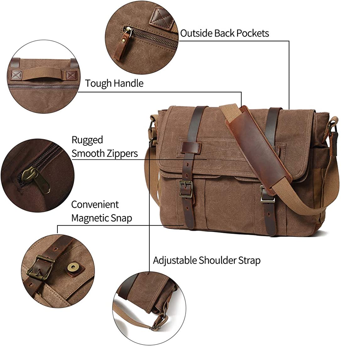 * This laptop messenger bag is a perfect satchel bag you don’t want to miss. Presented in crazy horse genuine leather and rugged waxed canvas, disordered wrinkles and scratches on surface, as it presents the style of retro and wildness, which make you stand out of all.* Briefcase for men is equipped with plenty room of 13 pockets, ends chaos and keeps everything in neat. You can also take your laptop and tablet in it for business, school, everyday, overnight and other situations, as there is fully padded laptop sleeve and tablet sleeve with velcro.* Satchel bags for men can be carried as briefcase, sling bag, crossbody bag via the handle and shoulder bag.FeatureMaterial: Cowhide Genuine Leather & Rugged Waxed Canvas Color: Brown / GreyStructure Details* Outer:- 1 back pocket with zipper for books; - 2 pockets with magnetic snaps within the flap for easy-access; - 2 side pockets for small bottles and umbrella;* Inner:- 1 large compartment with fully padded in all sides for laptop; - 1 tablet compartment for protecting; - 1 zip pocket for your important belongings; - 1 large compartment for other things; - 1 Key clip to hang your key in right position; - 2 inner slip pockets for small gadgets; - 2 pen slots for your pen and sunglasses.Dimension* Messenger bag: 15.2"L * 4.3"W * 12.2"H* Laptop sleeve: 15"L * 10"WUpkeep1.Apply cream/moisture lotion onto the leather surface,and use a soft cloth to complete the upkeep.2.Avoid cleaning products with alcohol, turpentine or other mineral spirits as they will discolor and dry out leather.3.Never allow water to soak into your bag. If the bag gets wet, do not use a hair dryer on it. Instead, absorb as much water as possible with a thick microfiber hand towel and allow the bag to air dry.Package includes*1 x Leather Messenger Laptop Bag
