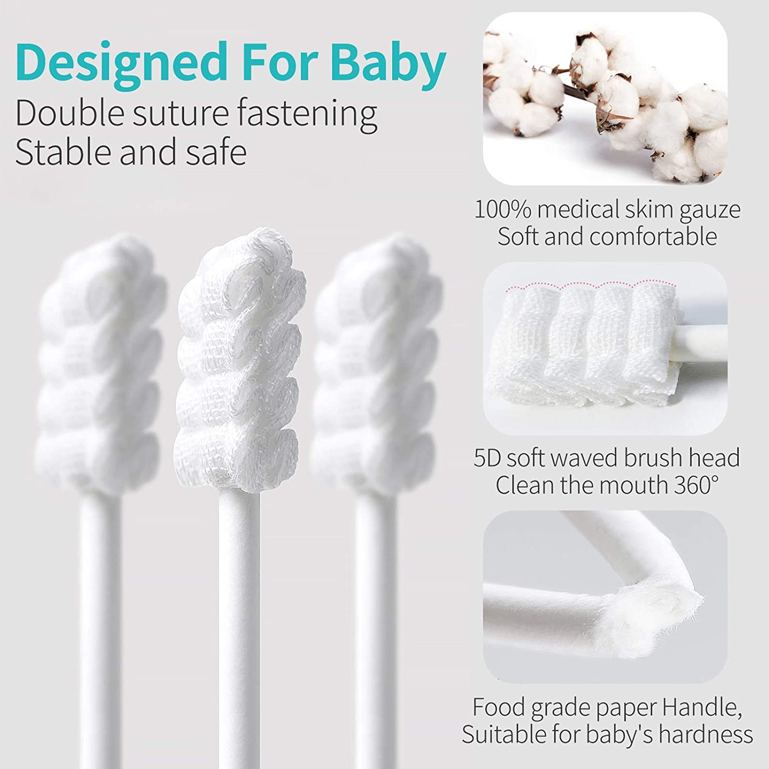 • ?‍♂️【Comfortable Material】: 100% medical skim gauze. The paper handle is safe and healthy for babies. 3D wave pattern, able to clean the mouth 360°. Soft, absorbent gauze for comfortable use without damaging the teeth and gums.