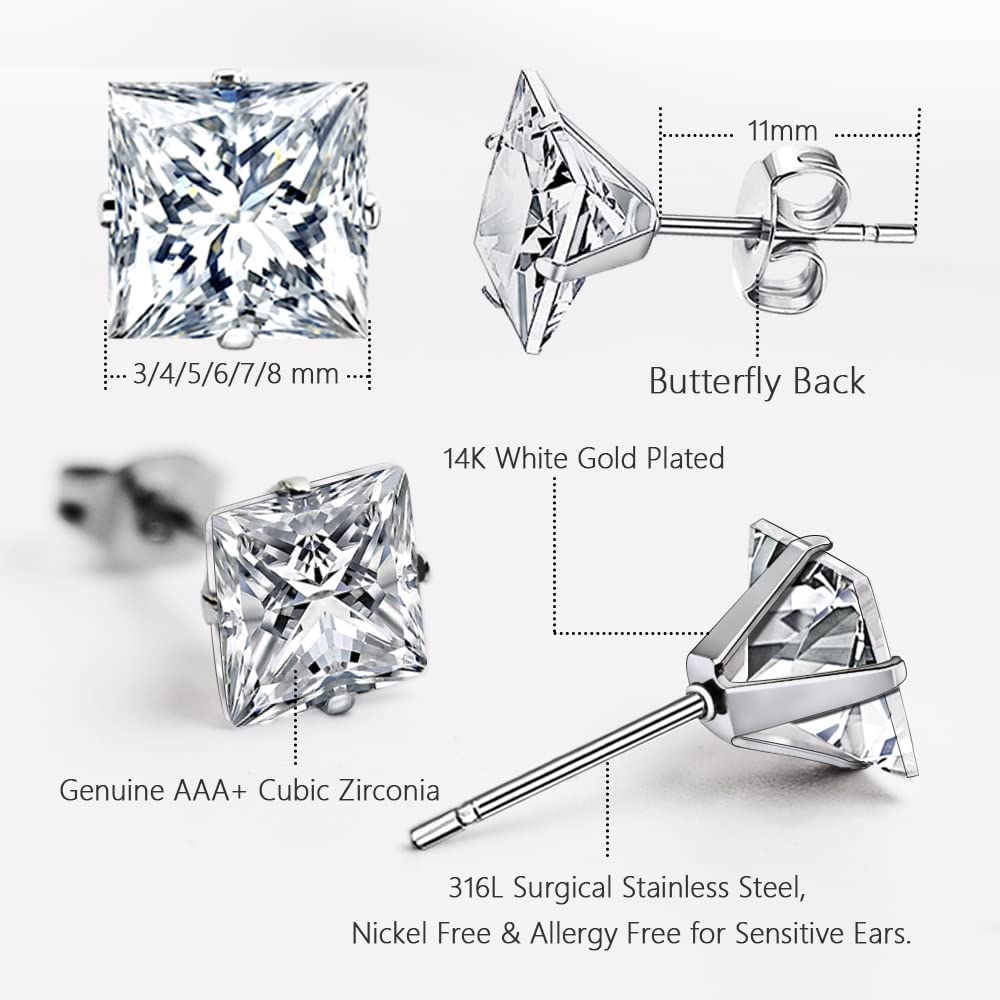 UHIBROS Stainless Steel Stud Earrings Set for Men, 14K White Gold Plated Square Cubic Zirconia Studs Hypoallergenic Mens Earrings Pack 6 Pairs