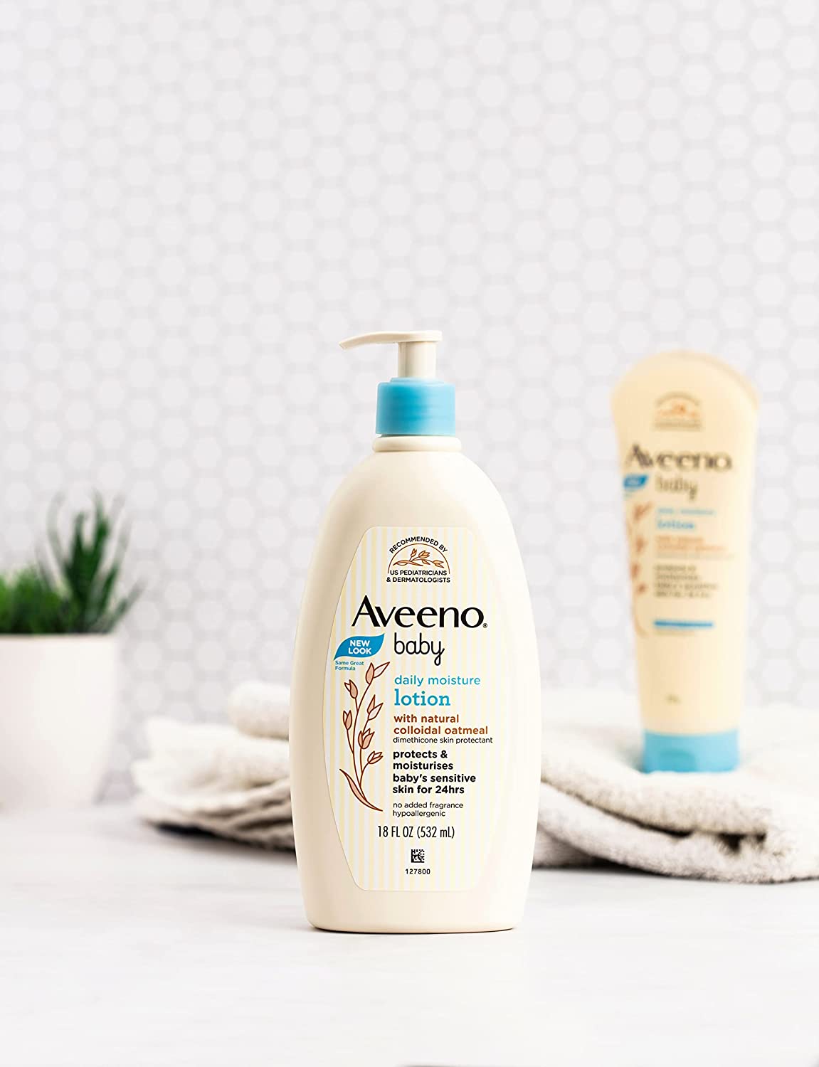 • 18-fluid ounces of Aveeno Baby Daily Moisture Body Lotion with natural colloidal oatmeal, dimethicone and rich emollients features a naturally nourishing formula that moisturizes for a full 24 hours